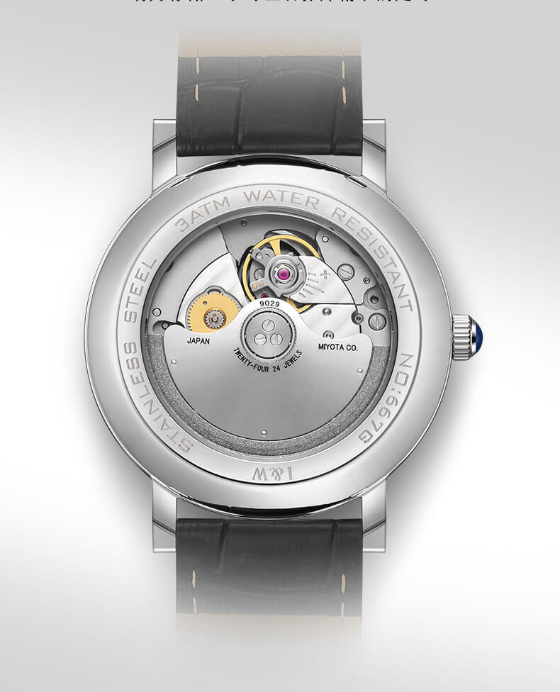 | Kiểu máy | Japan Miyota 9029 Automatic Super Slim Mov't (Máy cơ tự động siêu mỏng Miyota 9029 - Nhật Bản có độ chính xác cực cao): - 24 chân kính (Jewels). - Tần số dao động 28.800 vph. - Khả năng trữ cót lên đến hơn 42h. |