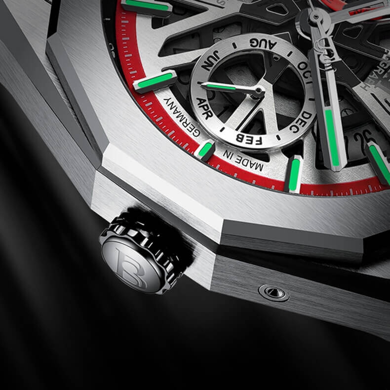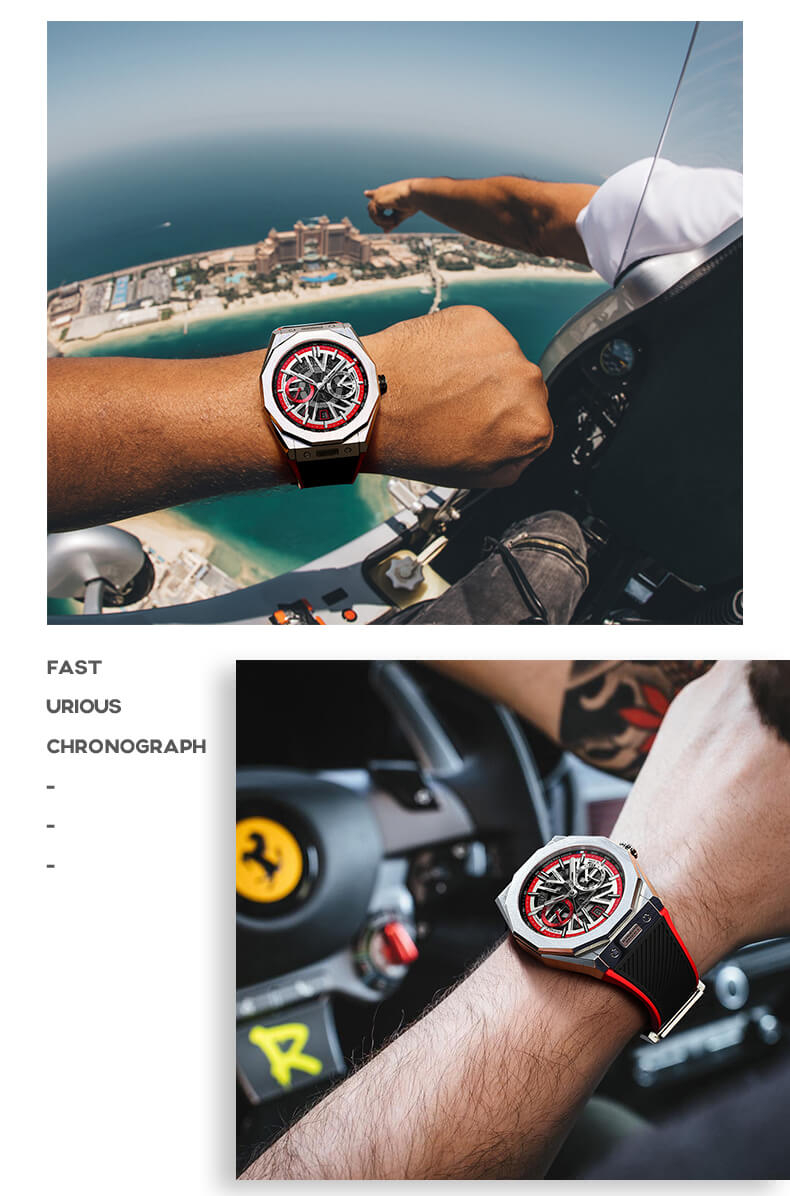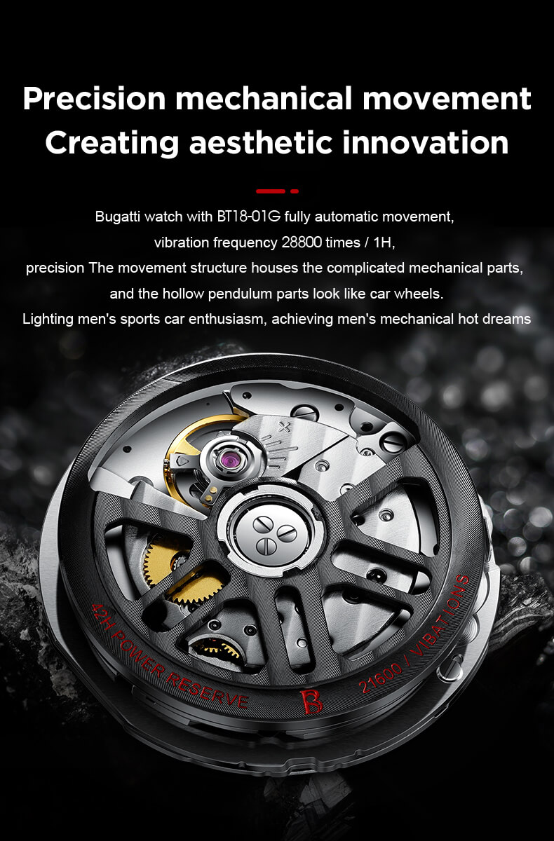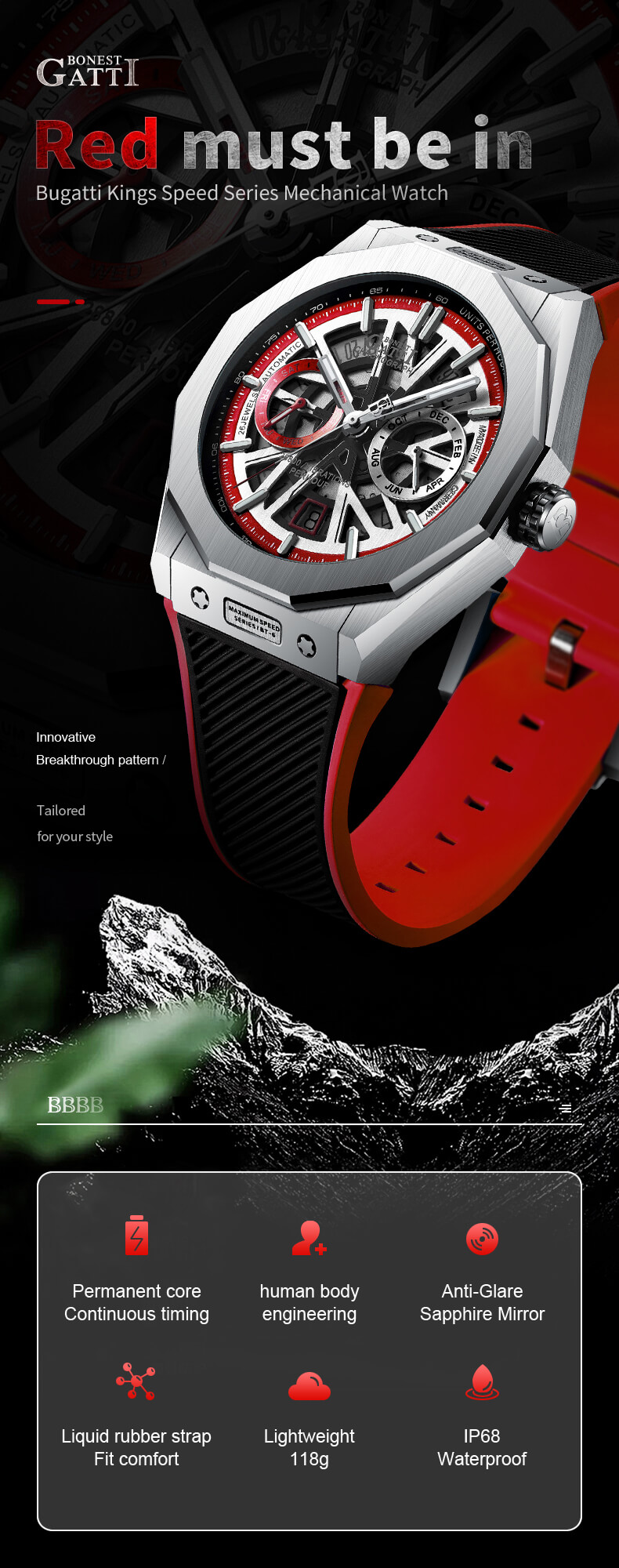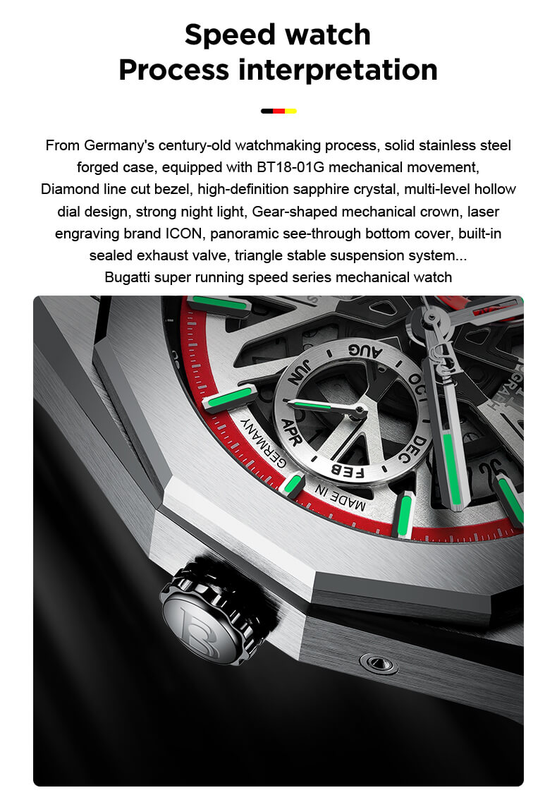 Đặc điểm nổi bật | - Phong cách thiết kế Sport watch dành cho những người đam mê thể thao tốc độ. - Chức năng: + Các mặt đồng hồ nhỏ chỉ tháng trong năm và ngày trong tuần. + Case back xuyên thấu. |