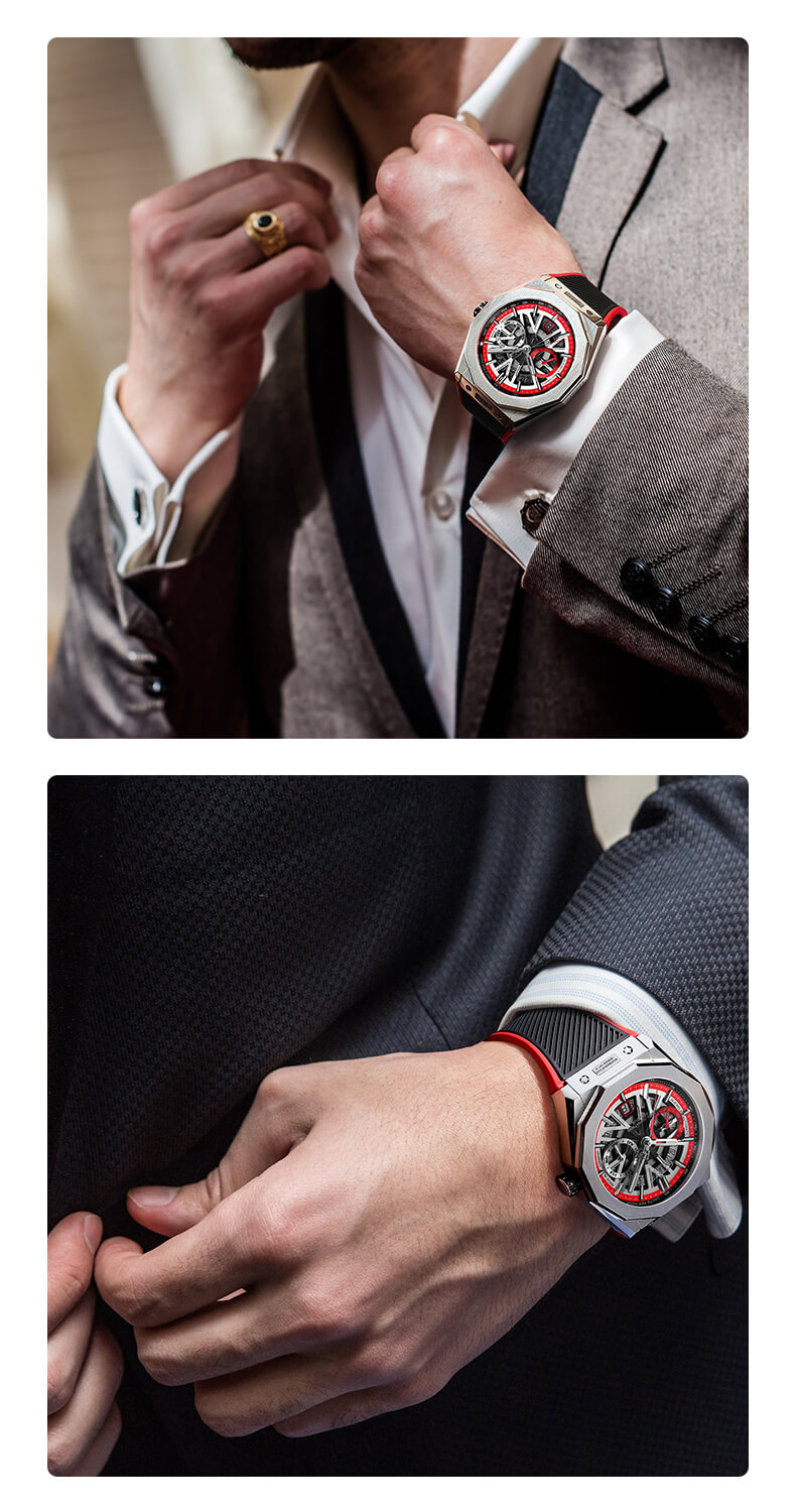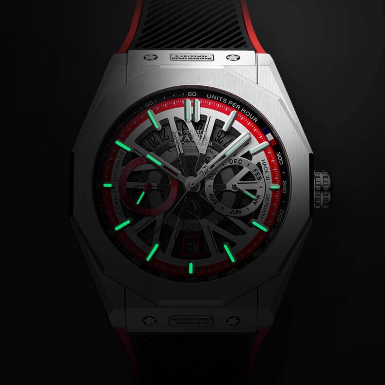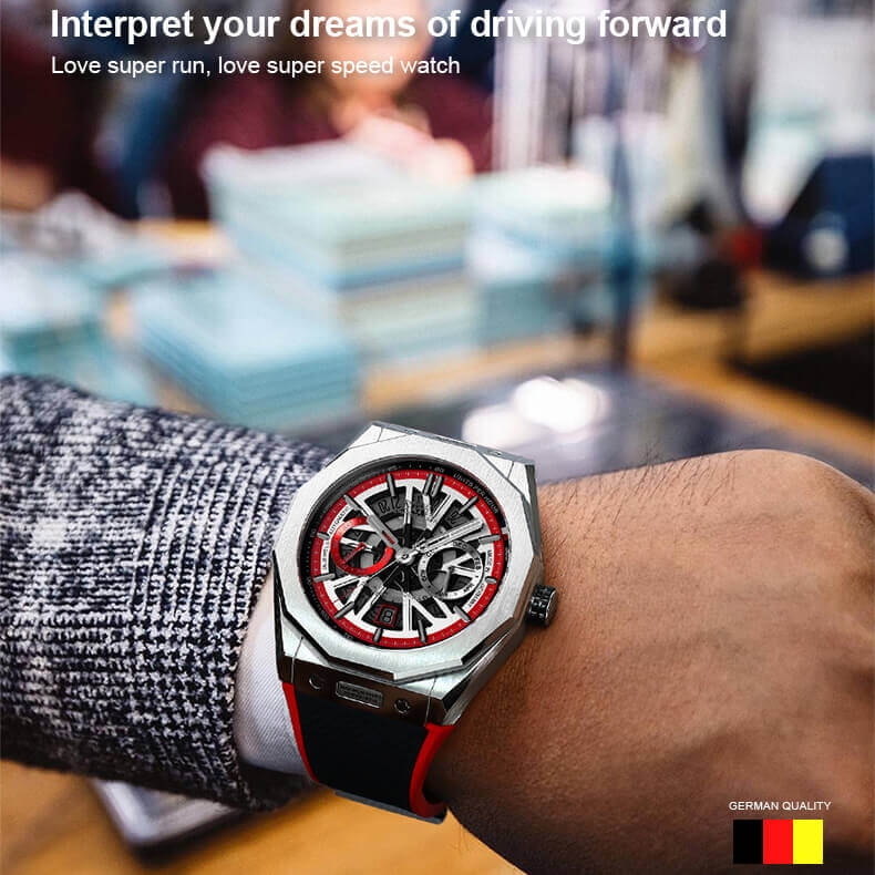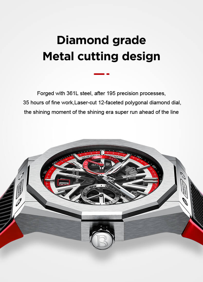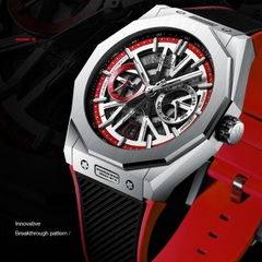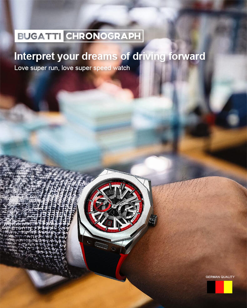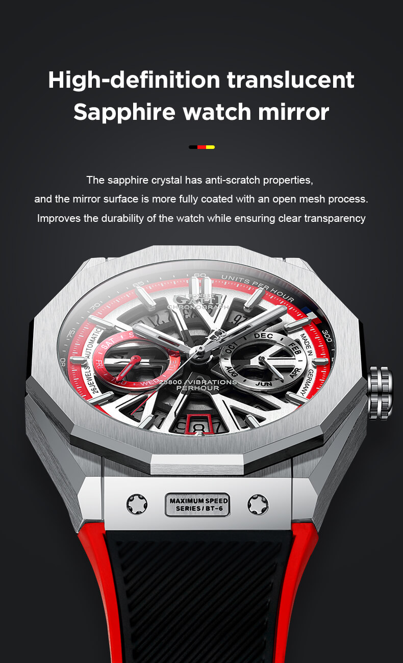 Đặc điểm nổi bật | - Phong cách thiết kế Sport watch dành cho những người đam mê thể thao tốc độ. - Chức năng: + Các mặt đồng hồ nhỏ chỉ tháng trong năm và ngày trong tuần. + Case back xuyên thấu. |