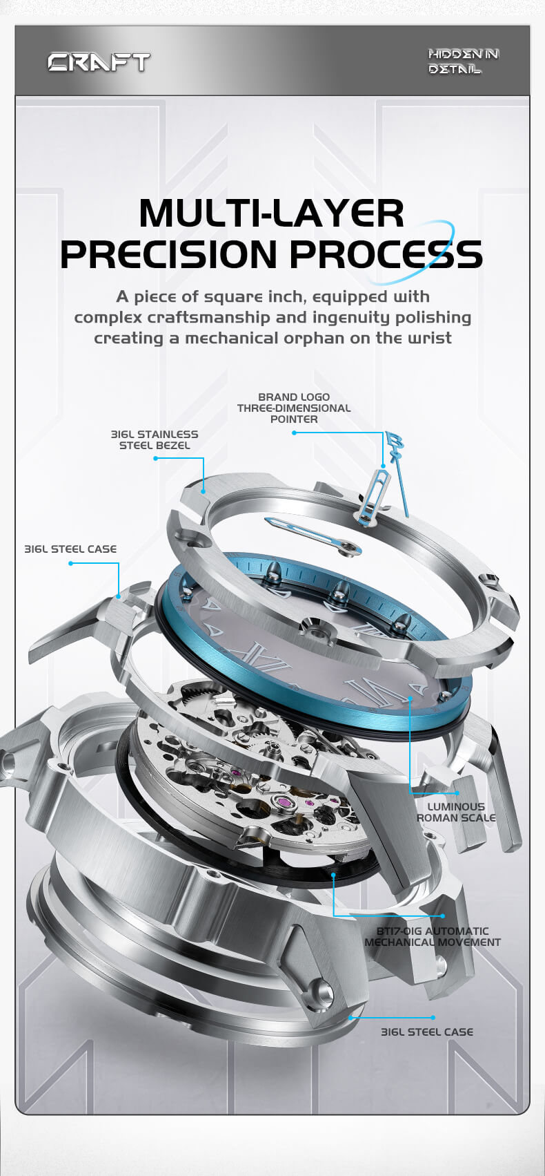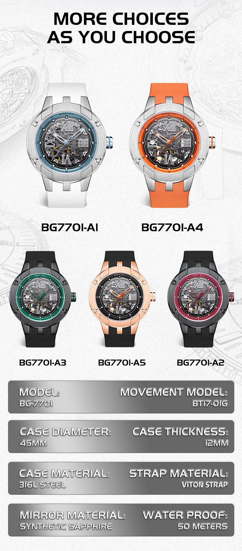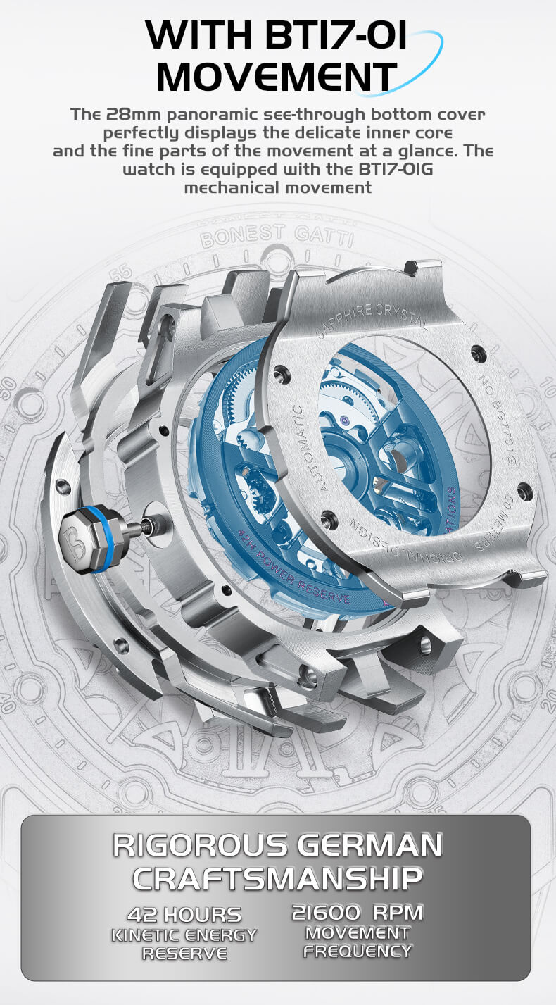 Đồng hồ Bonest Gatti Explorer BG7701 được tạo ra cho những người thích sưu tầm đam mê chơi đồng hồ với tầm nhìn độc đáo bằng cách kết hợp chất lượng cao và phong cách thể thao sang trọng, nhẹ nhàng một chất riêng biệt so với những thương hiệu đồng hồ khác.