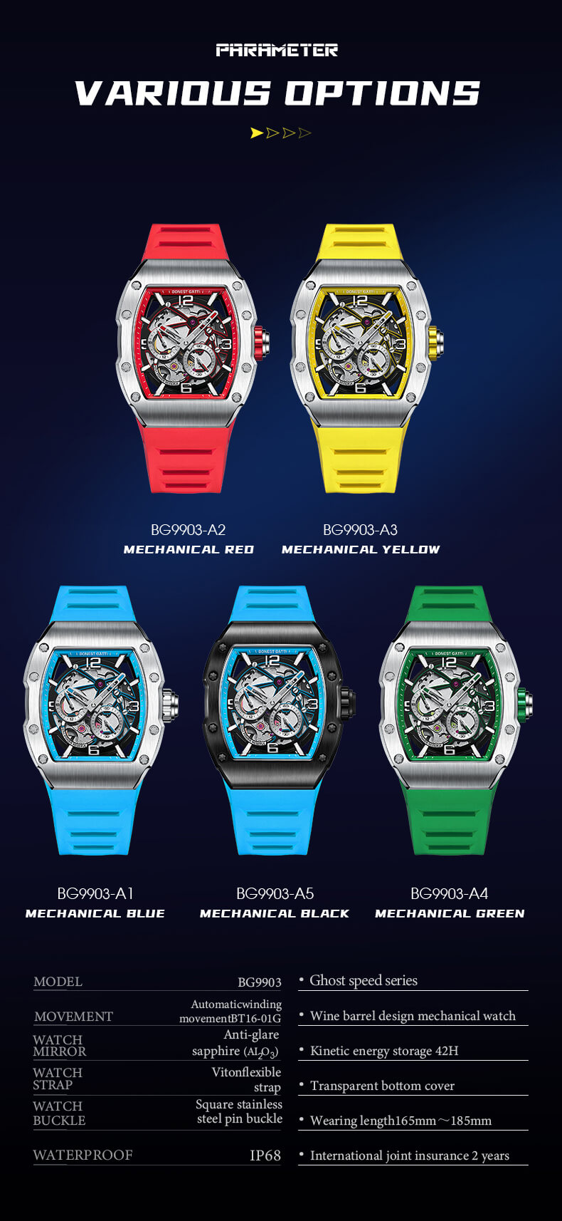 Máy cơ tự động của BG9903 là một điểm nhấn vượt trội, cho phép đồng hồ hoạt động một cách chính xác và đáng tin cậy. Điều này cũng là một yếu tố tăng tính thẩm mỹ của sản phẩm, vì người sử dụng có thể quan sát và thưởng thức cơ chế hoạt động của đồng hồ.