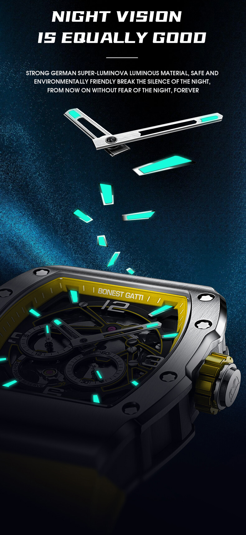 Bonest Gatti Ghost Speed BG9903 có dây đeo bằng cao su cao cấp, mang lại sự êm ái và thoải mái khi đeo trong thời gian dài. Đồng hồ còn được trang bị tính năng chống nước, giúp người sử dụng có thể sử dụng sản phẩm trong nhiều hoàn cảnh khác nhau mà không cần lo lắng về tình trạng bị nước làm hỏng.