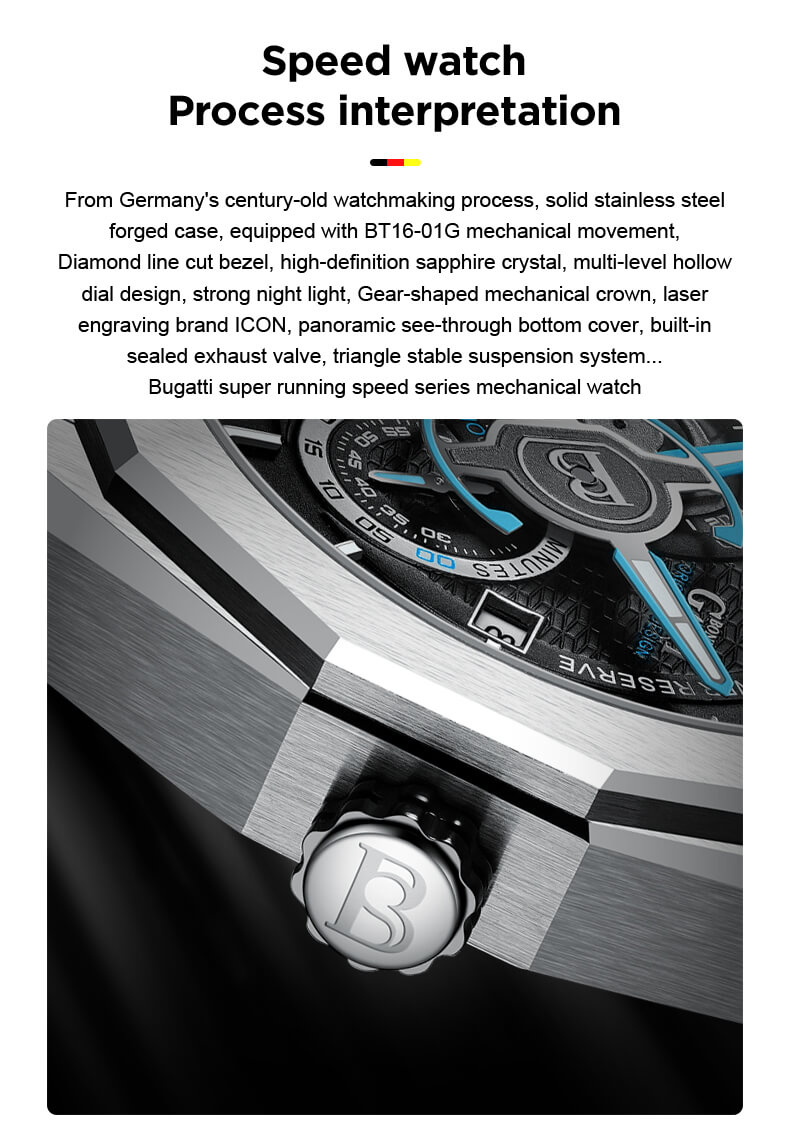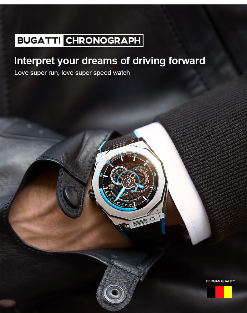 Đặc điểm nổi bật | - Phong cách thiết kế Sport watch dành cho những người đam mê thể thao tốc độ. - Chức năng: + Các mặt đồng hồ nhỏ chỉ ngày, giờ và phút. + Case back xuyên thấu. |