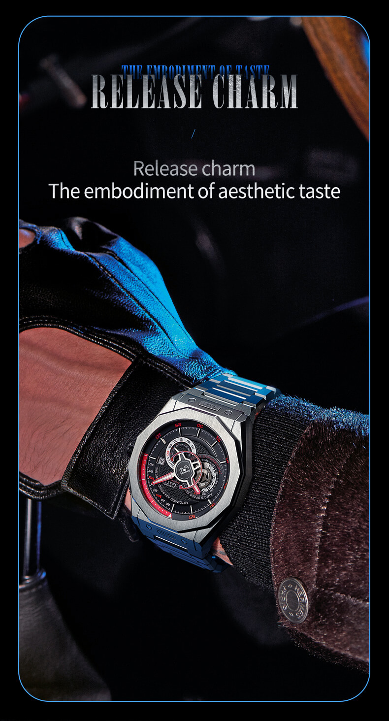 Đặc điểm nổi bật | - Phong cách thiết kế Sport watch dành cho những người đam mê thể thao tốc độ. - Chức năng: + Các mặt đồng hồ nhỏ chỉ ngày, giờ và phút. + Case back xuyên thấu. |