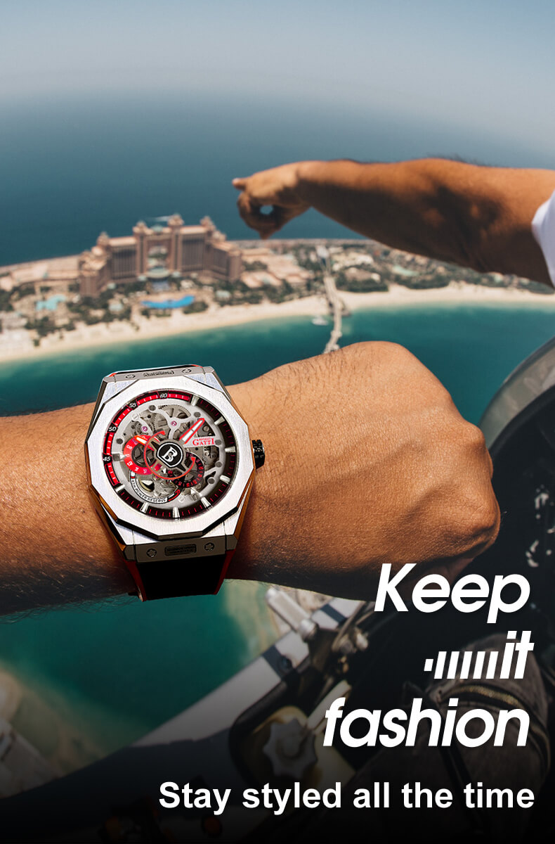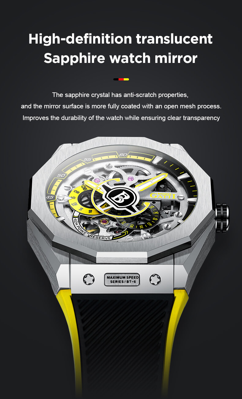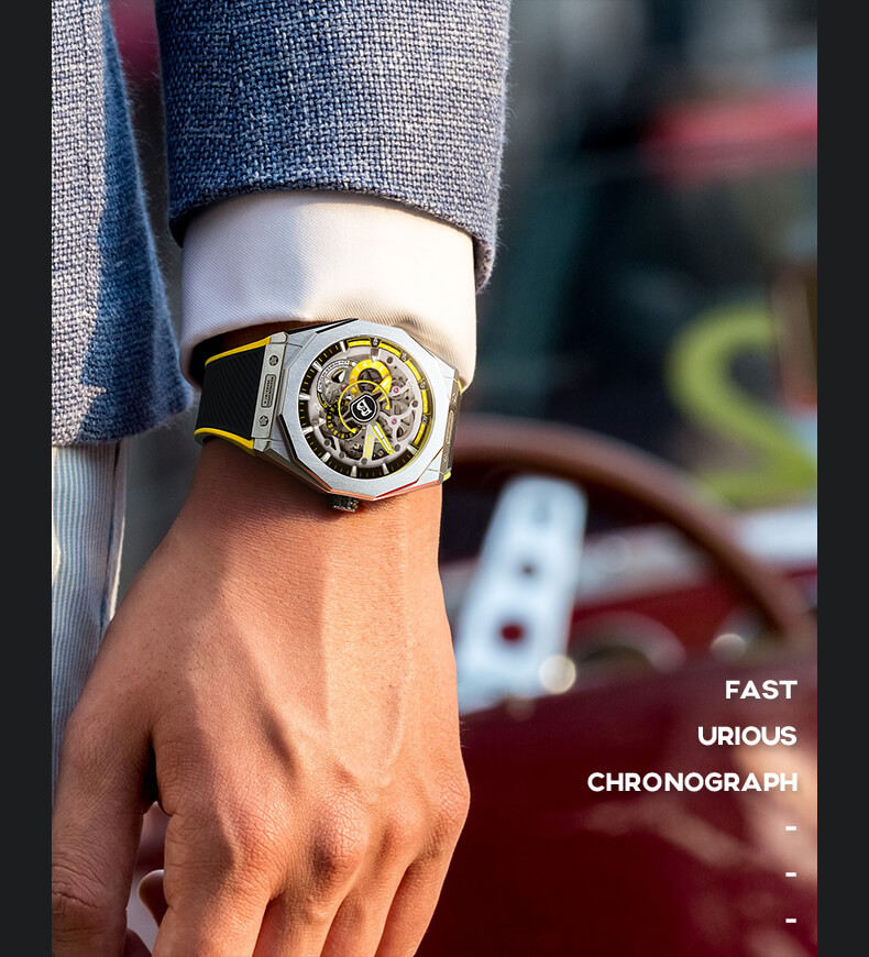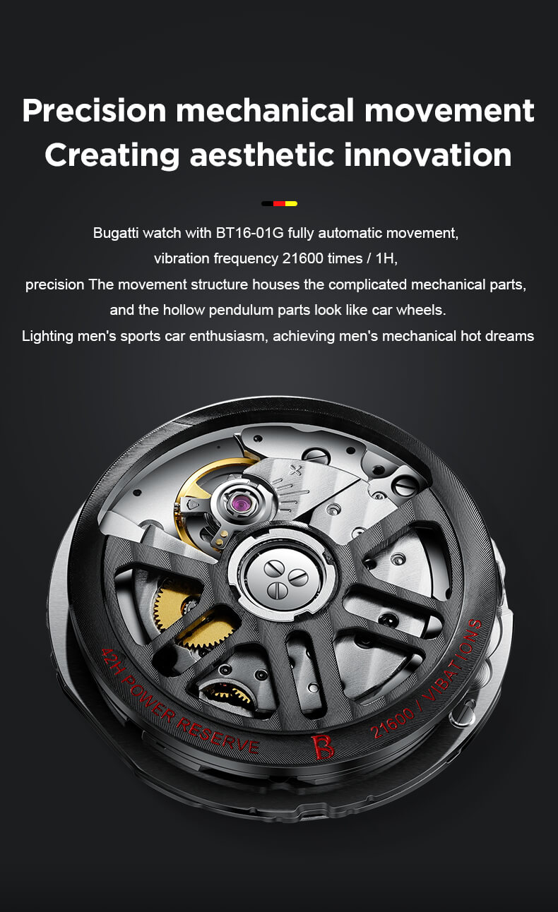 Đặc điểm nổi bật | - Phong cách thiết kế Sport watch dành cho những người đam mê thể thao tốc độ. - Chức năng: + Các mặt đồng hồ nhỏ chỉ giờ và giây. + Case back xuyên thấu. |