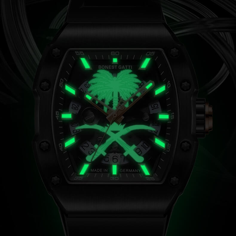 Đặc điểm nổi bật | - Phong cách thiết kế Sport watch dành cho những người đam mê thể thao tốc độ. - Chức năng: + Lịch ngày. + Mặt chạm khắc hình cây dừa độc đáo phủ dạ quang. + Case back xuyên thấu. |