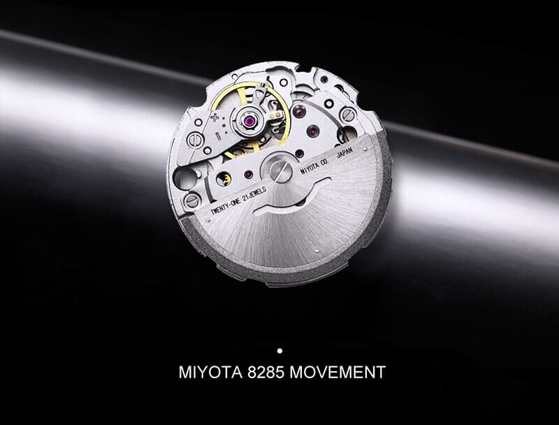 Japan Miyota Automatic Mov't (Máy cơ tự động Miyota - Nhật Bản): - 21 chân kính (Jewels). - Tần số dao động 21.600 vph. - Khả năng trữ cót lên đến hơn 42h. |