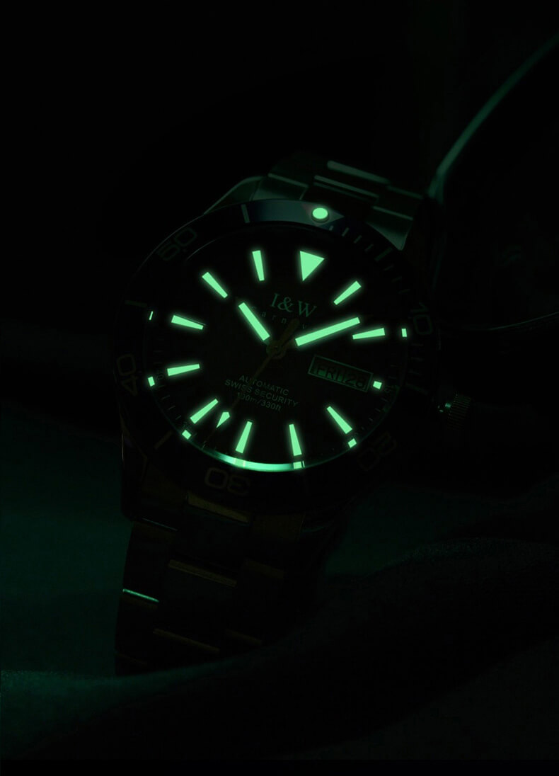 - Mặt số và kim đồng hồ phủ dạ quang.