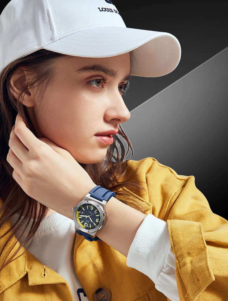 Độc đáo của thiết kế nằm ở mặt số với nền màu xanh cùng tone dây xanh siêu chất, các chi tiết hiển thị nổi bật đậm chất thể thao mở ra không gian trẻ trung, phóng khoáng.