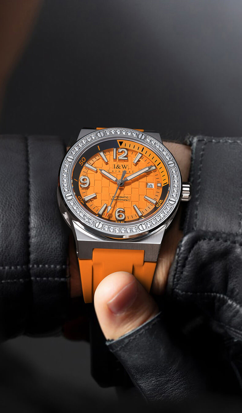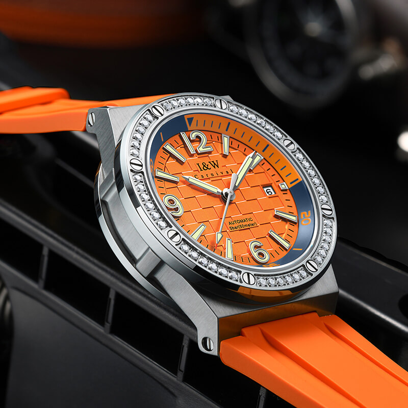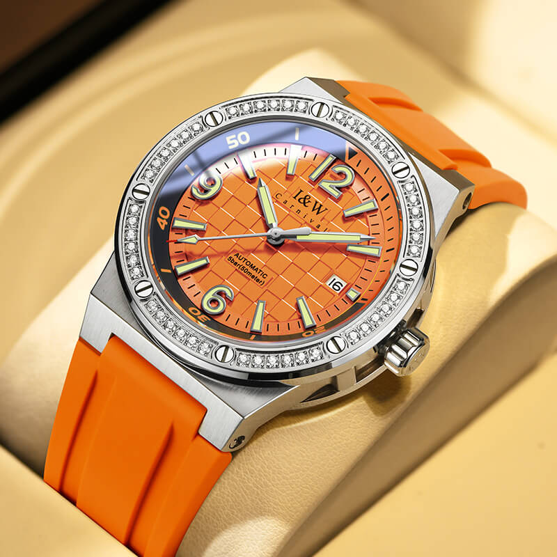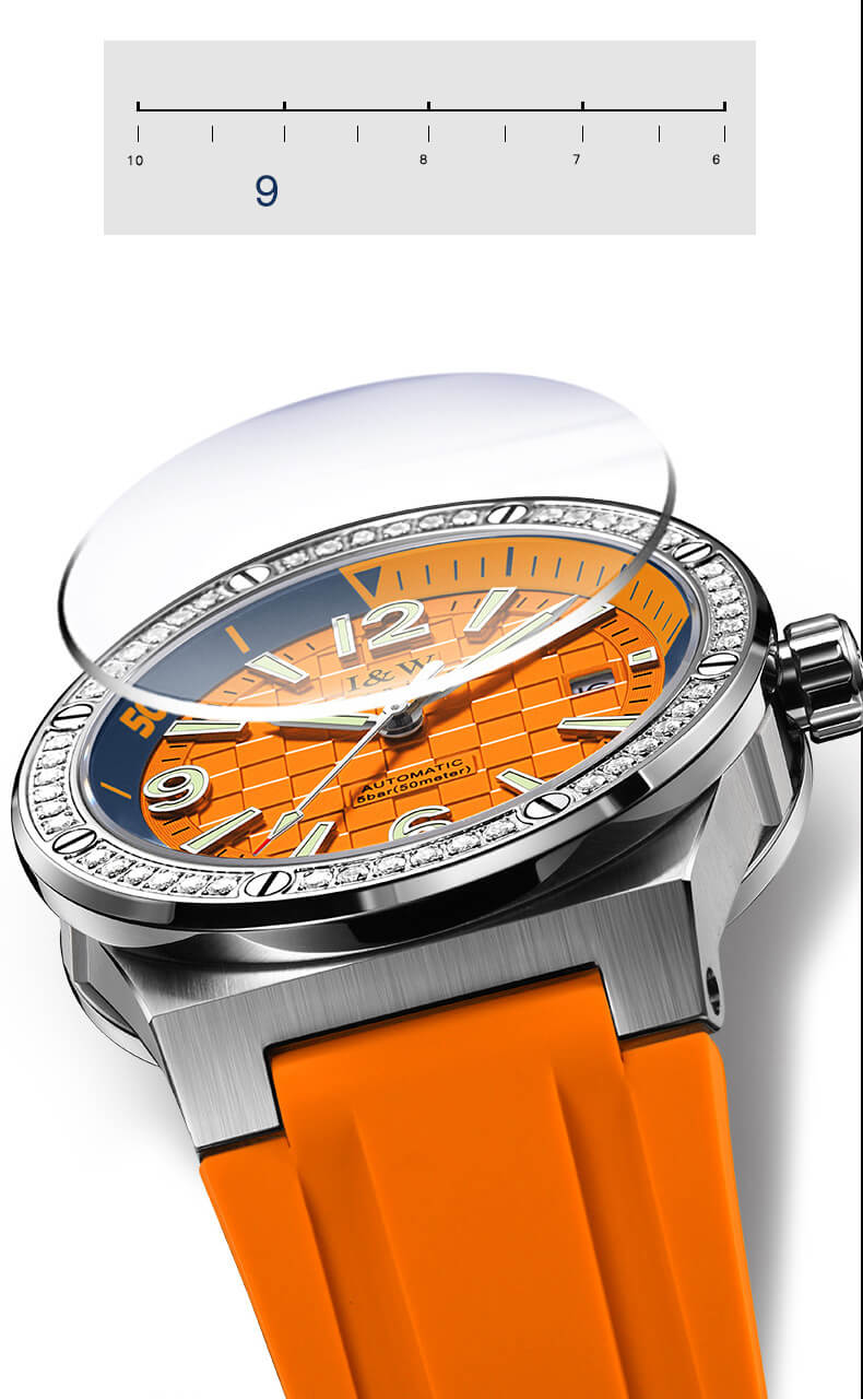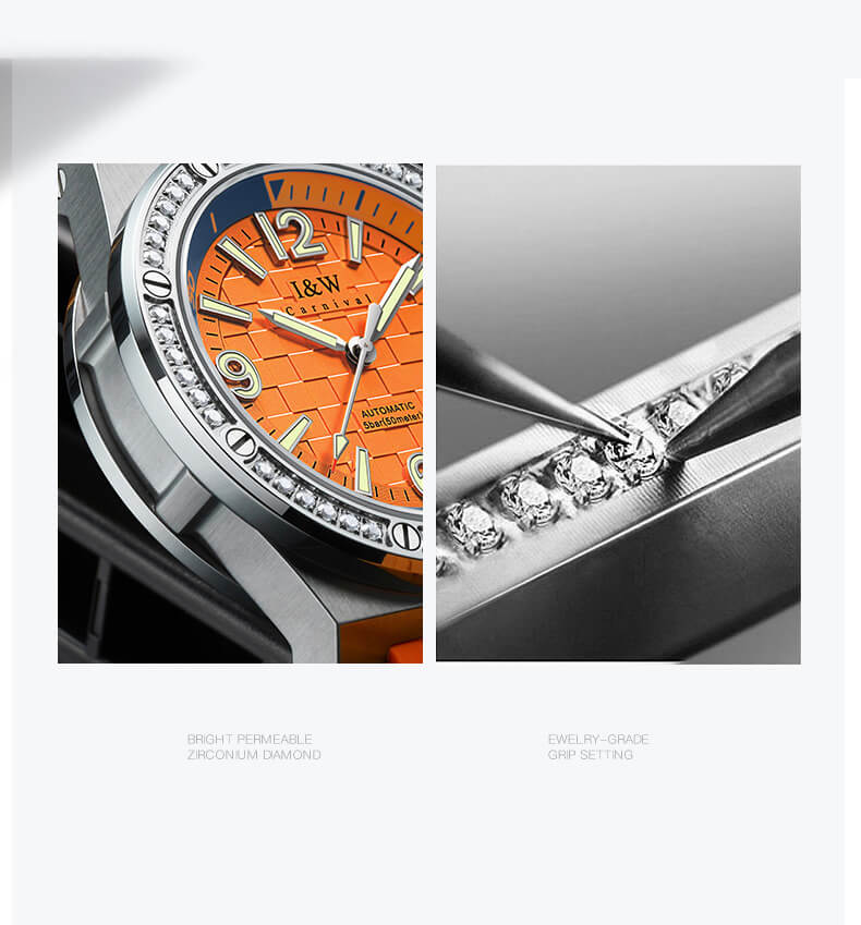 Đặc điểm nổi bật | - Phong cách thiết kế Sport watch. - Chức năng: Lịch ngày (01-31) tại vị trí 3 giờ. - Kim và mặt số phủ dạ quang. - Viền đính kim cương nhân tạo. - Case back xuyên thấu. |