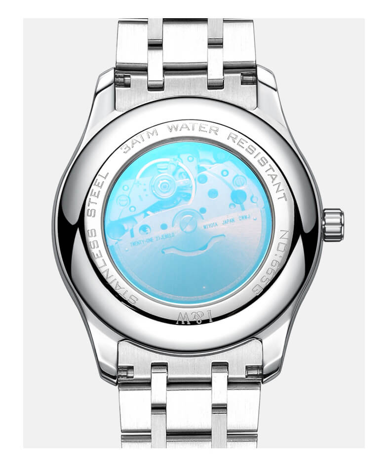 Kiểu máy | Japan Miyota Automatic Mov't (Máy cơ tự động Miyota - Nhật Bản): - 21 chân kính (Jewels). - Tần số dao động 21.600 vph. - Khả năng trữ cót lên đến 40h. |
