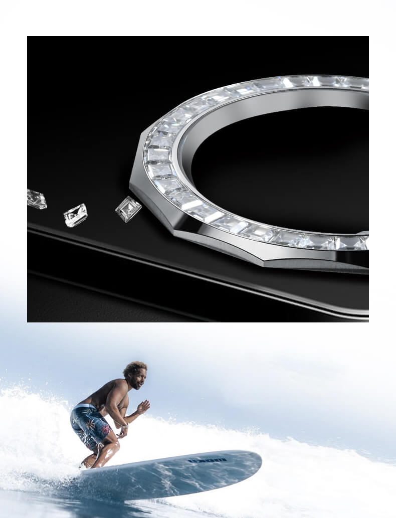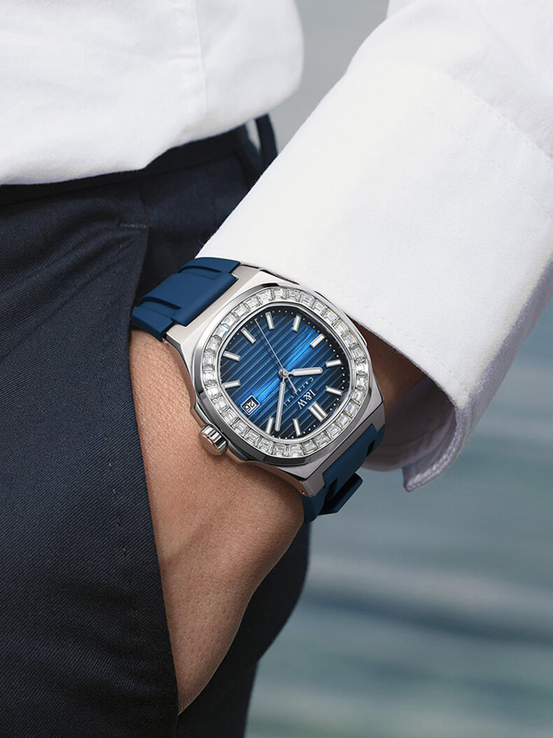 👉 Mặt số được chia thành các đường kẻ bằng nhau, tạo ra một cảm giác độc đáo phá cách. Viền mặt đồng hồ được đính đá lấp lánh, tạo điểm nhấn lộng lẫy và thu hút ánh nhìn từ mọi góc độ.