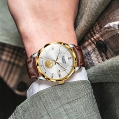 Đặc điểm nổi bật | - Phong cách thiết kế Dress watch. - Lịch ngày (từ 1 đến 31) góc 3 giờ. - Góc 6 giờ chạm khắc biểu tượng thuận buồm xuôi gió mang lại sự may mắn, thuận lợi, thành công cho người sử dụng. - Mạ vàng gold 24K. - Case back xuyên thấu. |