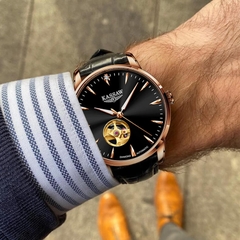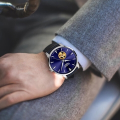 Đặc điểm nổi bật | - Phong cách thiết kế Dress watch. - Lộ cơ Open Heart góc 7 giờ. - Điểm nhấn nằm ở cọc số góc 12 giờ được đính Kim cương nhân tạo giúp các Quý ông nổi bật hơn trước đám đông. - Case back xuyên thấu. |