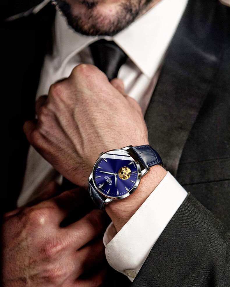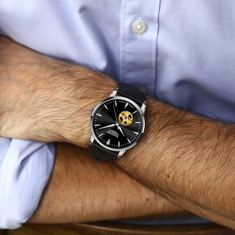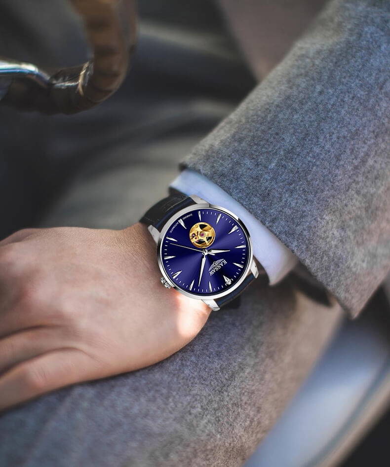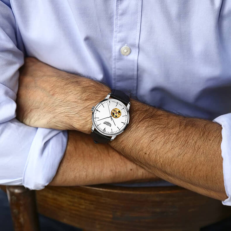 Đặc điểm nổi bật | - Phong cách thiết kế Dress watch. - Lộ cơ Open Heart góc 7 giờ. - Điểm nhấn nằm ở cọc số góc 12 giờ được đính Kim cương nhân tạo giúp các Quý ông nổi bật hơn trước đám đông. - Case back xuyên thấu. |
