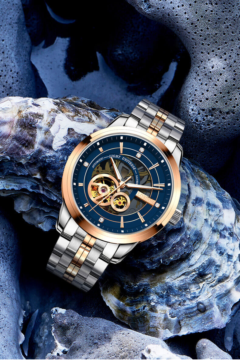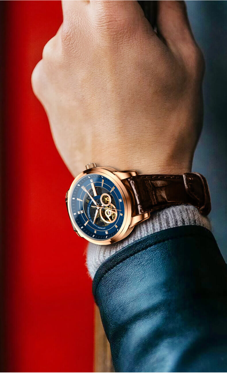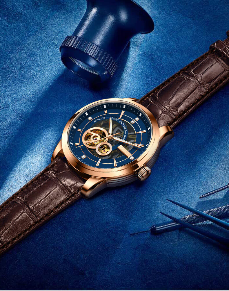 Thiết kế OPEN HEART vô cùng nổi bật phô diễn trọn vẹn chi tiết máy trên nền xanh huyền bí - để lộ những viên chân kính màu hồng tím lấp lánh, phô diễn nhịp thở cơ khí một cách khéo léo. Một vẻ đẹp quyến rũ rất hiếm khi tìm thấy ở những chiếc đồng hồ tầm trung.