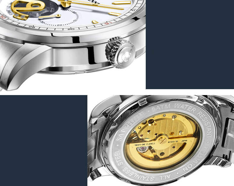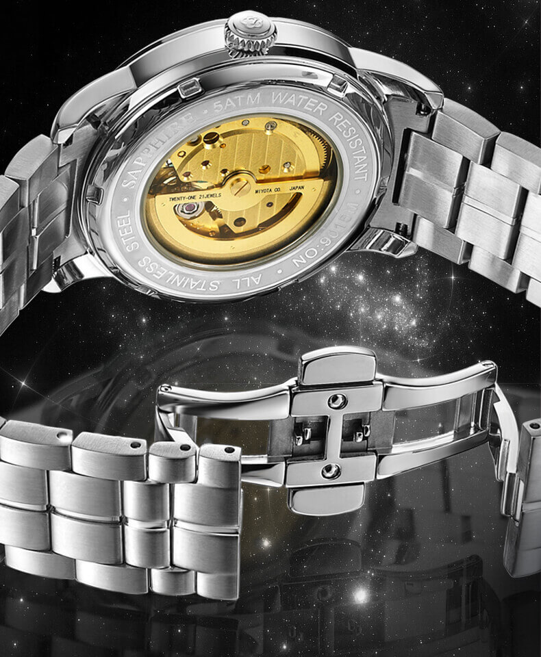 Chất liệu THÉP không gỉ 316L cùng công nghệ mạ PVD bền đẹp, sáng bóng càng làm tăng thêm vẻ ngoài SANG TRỌNG và LÔI CUỐN.