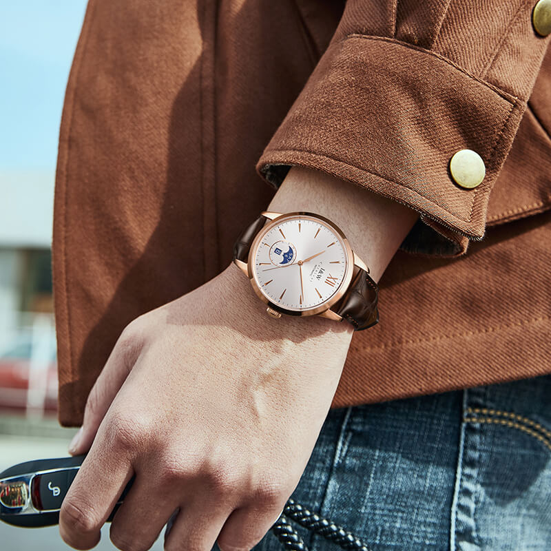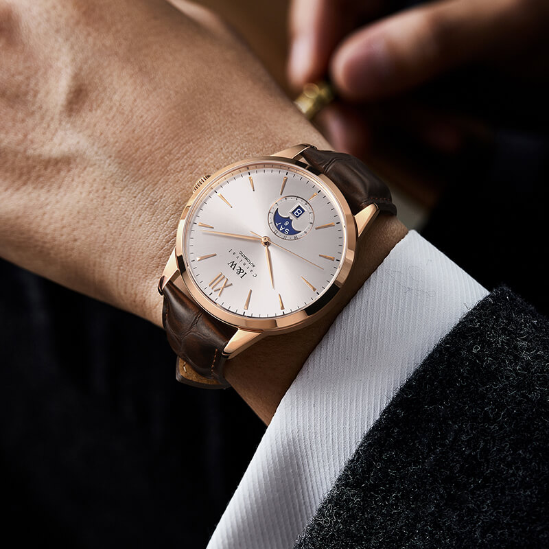 Đặc điểm nổi bật | - Phong cách thiết kế Dress watch. - Mặt số cọc kết hợp số La Mã. - Chức năng: Lịch ngày (01-31), lịch thứ thiết kế dạng đĩa quay (Mon-Sun) tại vị trí 6 giờ. - Vỏ mạ PVD cao cấp màu vàng hồng. - Case back xuyên thấu. |