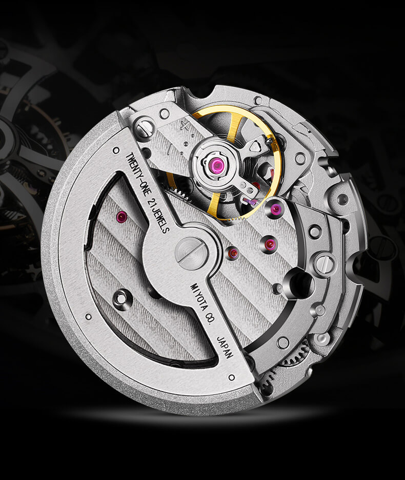 Vận hành bằng bộ máy cơ Japan Miyota Automatic Mov't nâng cấp, hoạt động mạnh mẽ và bền bỉ với 21 chân kính, tần số dao động 21600 vph, trữ cót hơn 42 giờ liên tục