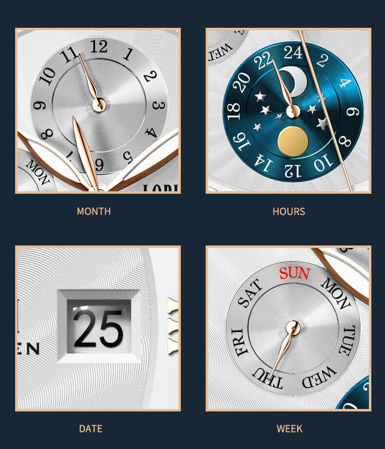 Mặt đồng hồ "6 KIM - 4 LỊCH" phô bày trọn vẹn 3 cột mốc thời gian cùng điểm nhấn SUN & MOON đầy bí ẩn có khả năng xoay vần, giúp người đeo biết được ngày - đêm, vừa nổi bật vừa là điểm nhấn giá trị cho cỗ máy này.