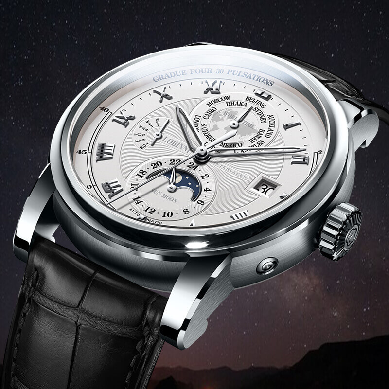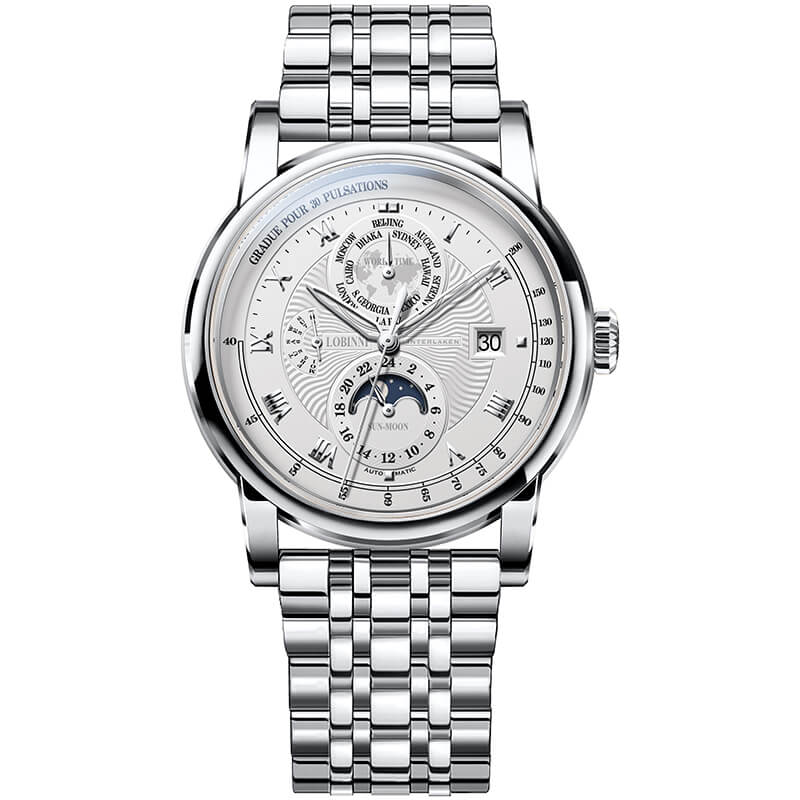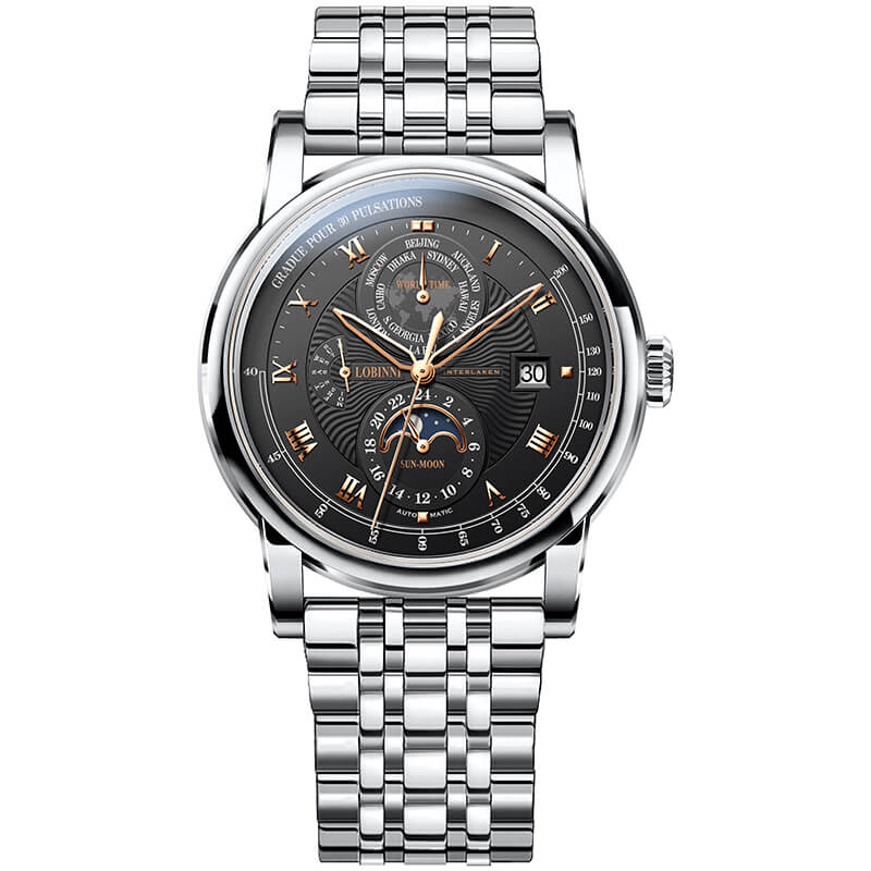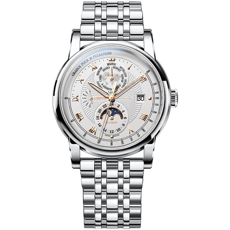 Lobinni No.16003 có rất nhiều tính năng xịn như lịch giờ thế giới, lịch ngày, lịch thứ và lịch Sun&Moon. Do đó, mặt số nghiêng đậm về tính thể thao mà nam giới nào cũng say mê khi mới nhìn vào.