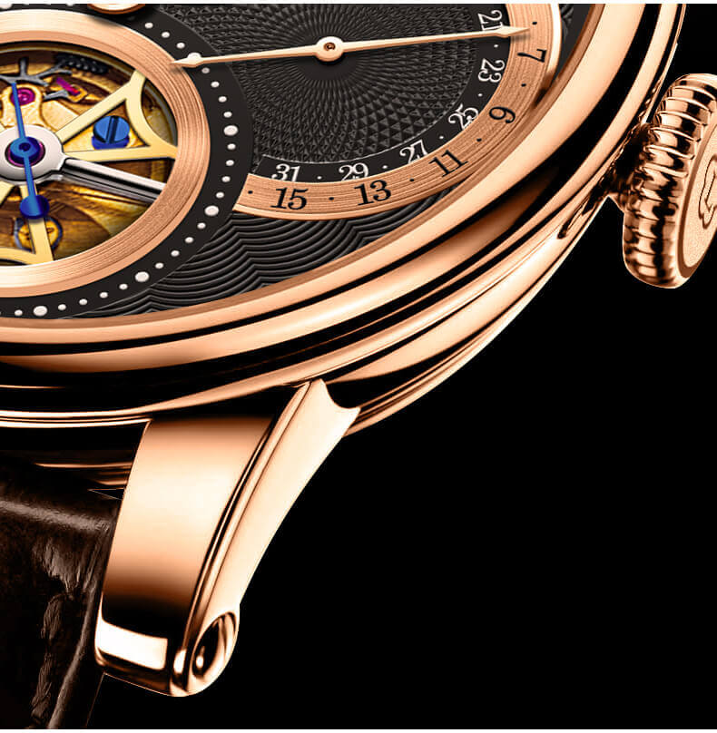 Mặt đồng hồ "BẮT NHỊP" thời đại với thiết kế hở van tim (OPEN-HEART) ở 6h giờ giúp phô diễn vẻ đẹp hoàn hảo của những chuyển động tinh xảo. Đối xứng bên trên là mặt đồng hồ 24h khảm trai cực kì ấn tượng. Hai bên là lịch thứ và lịch ngày, cách làm lịch này khá thú vị này tạo nên tổng thể CỰC KỲ HÚT MẮT và độc đáo cho sản phẩm.