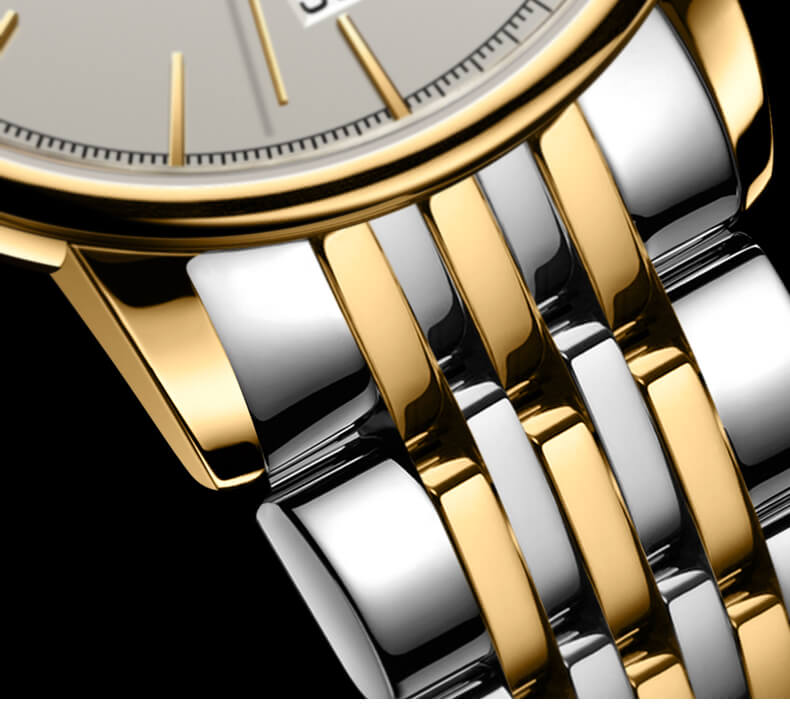 Lớp vỏ cũng như dây đeo được làm bằng thép không gỉ 316L cùng mạ vàng PVD giúp màu sắc đồng hồ bóng bẩy, sang trọng.