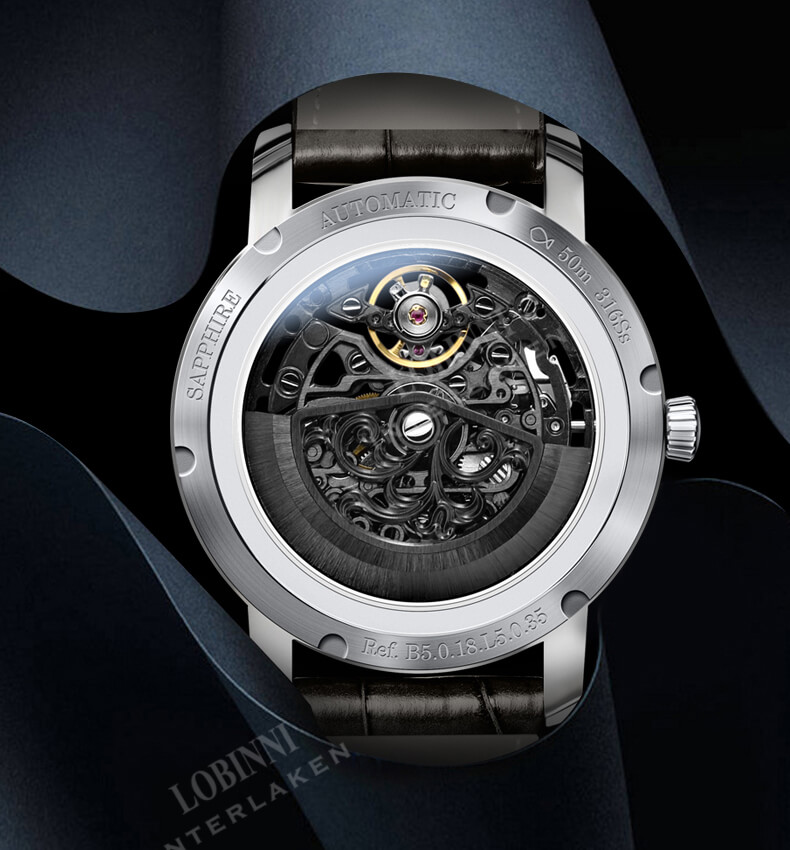 Mặt kính của chiếc Lobinni No.5018 này là kính Sapphire nguyên khối được vát cong, tạo độ sâu khi chiêm ngưỡng mặt đồng hồ.