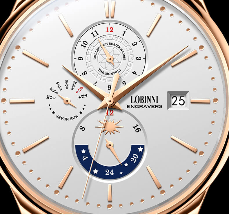Điểm thu hút lớn nhất của Lobinni No.815 chắc chắn là các chi tiết trên mặt đồng hồ, cực kỳ ấn tượng với ô lịch Sun & Moon. Bên cạnh đó là các cửa sổ để hiển thị lịch thứ và lịch ngày, tất cả đều được sắp xếp rất hợp lý tạo nên một tổng thể bắt mắt.
