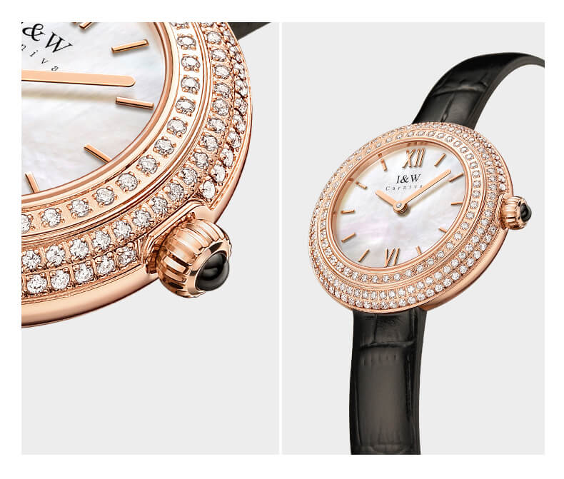 - Viền đồng hồ đính 3 vòng đá quý.