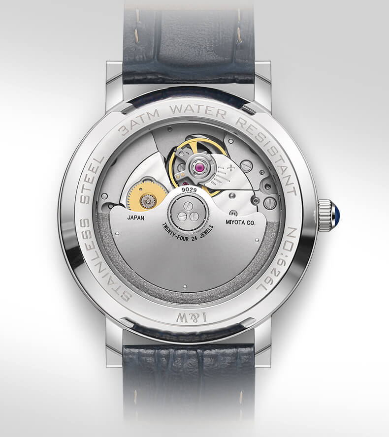 Kiểu máy | Japan Miyota 9029 Automatic Super Slim Mov't (Máy cơ tự động siêu mỏng Miyota 9029 - Nhật Bản có độ chính xác cực cao): - 24 chân kính (Jewels). - Tần số dao động 28.800 vph. - Khả năng trữ cót lên đến hơn 42h. |