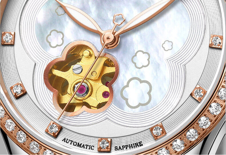 Không chỉ là LỘ CƠ OPEN HEART, cỗ máy còn để lấp ló những chuyển động cơ khí qua khuôn hình bông hoa vô cùng độc đáo.