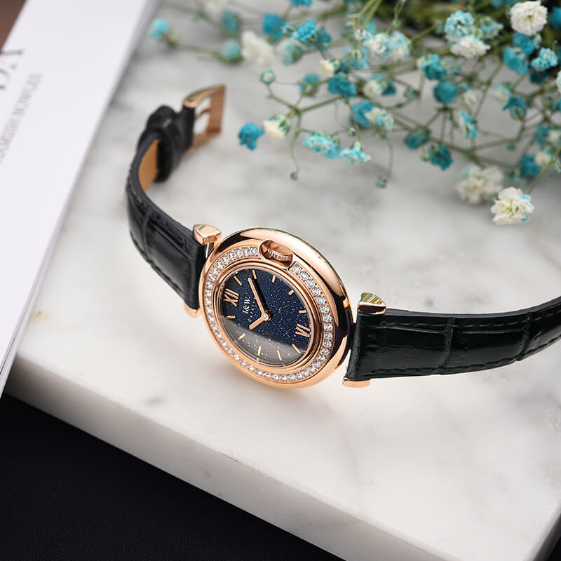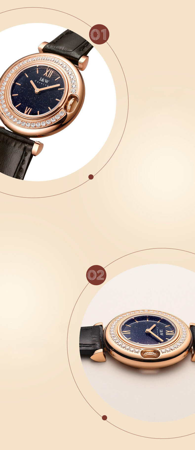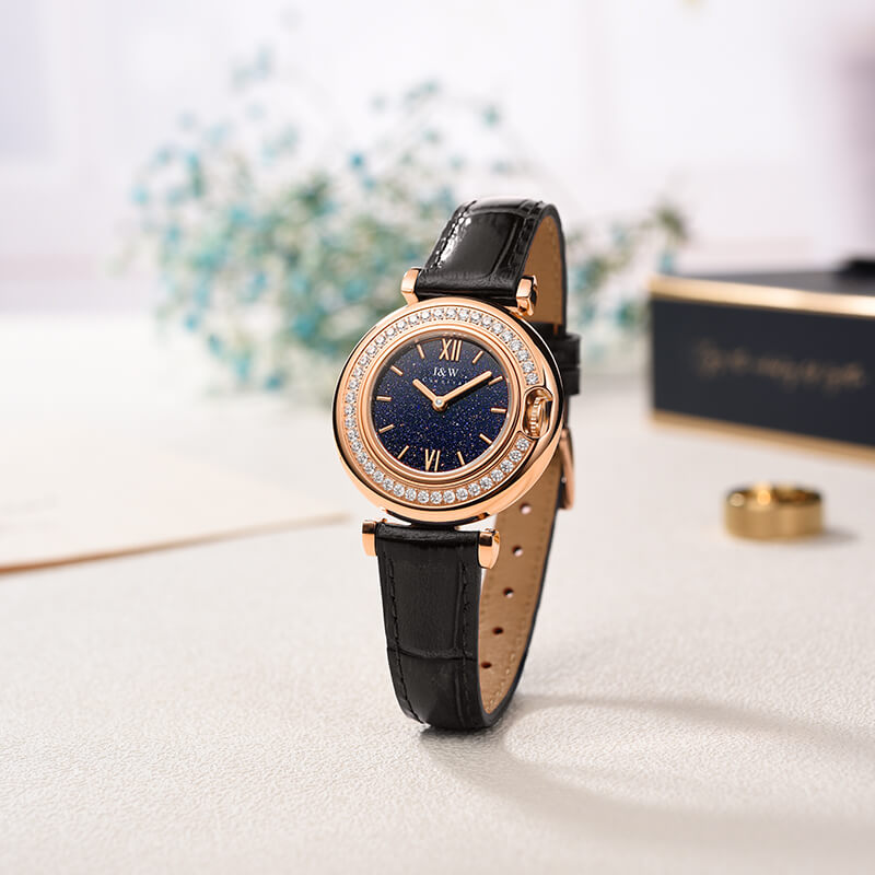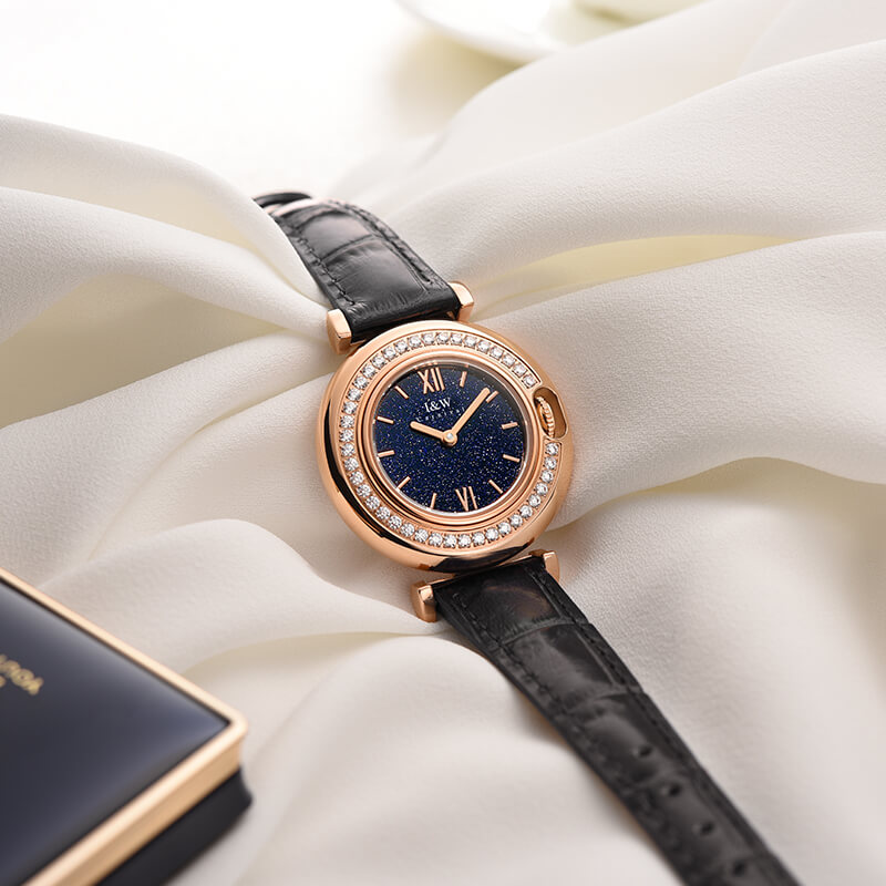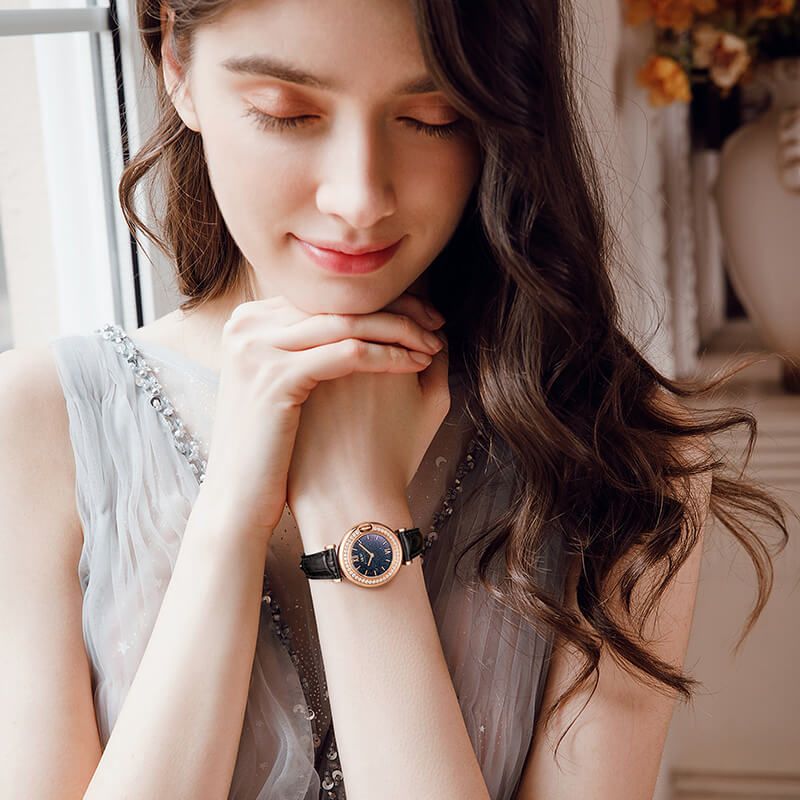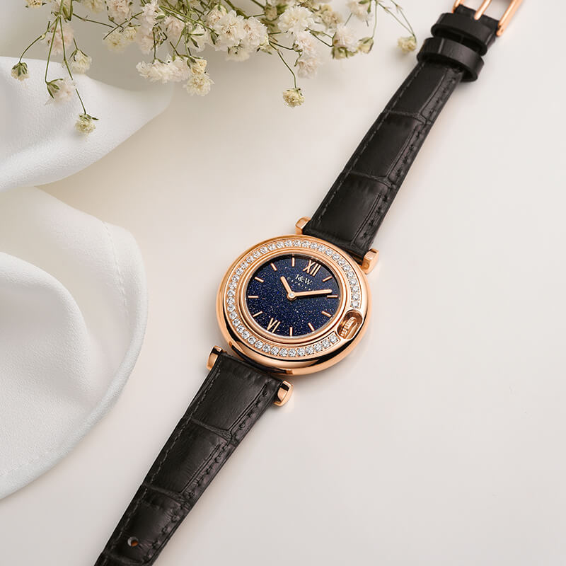 - Phong cách thiết kế Dress watch với mặt đồng hồ màu xanh đen phủ đá quý thể hiện bầu trời đêm đầy sao lấp lánh.