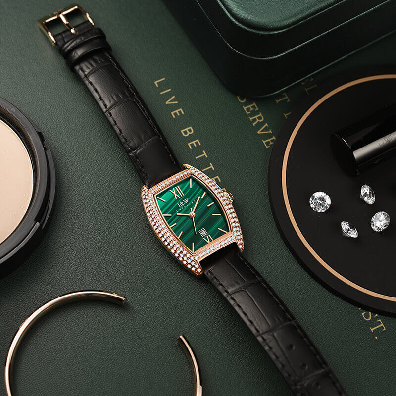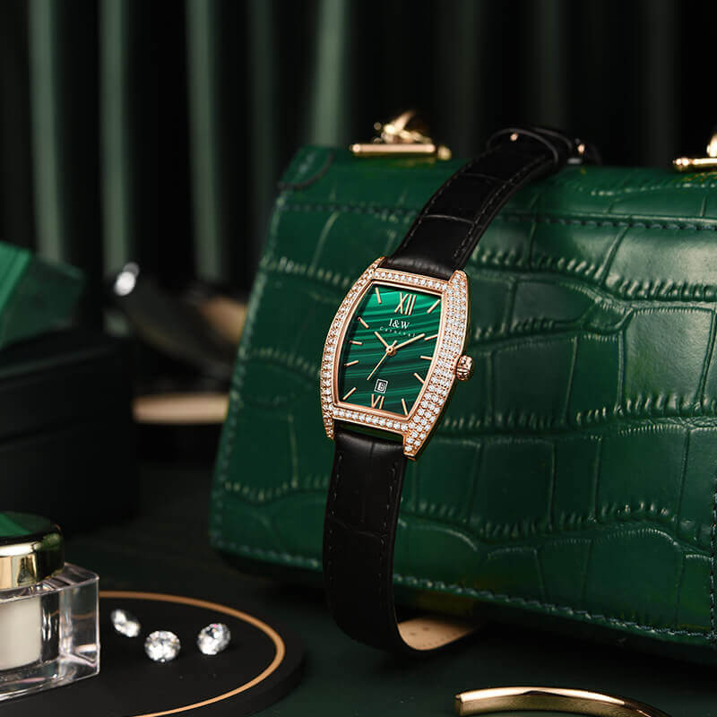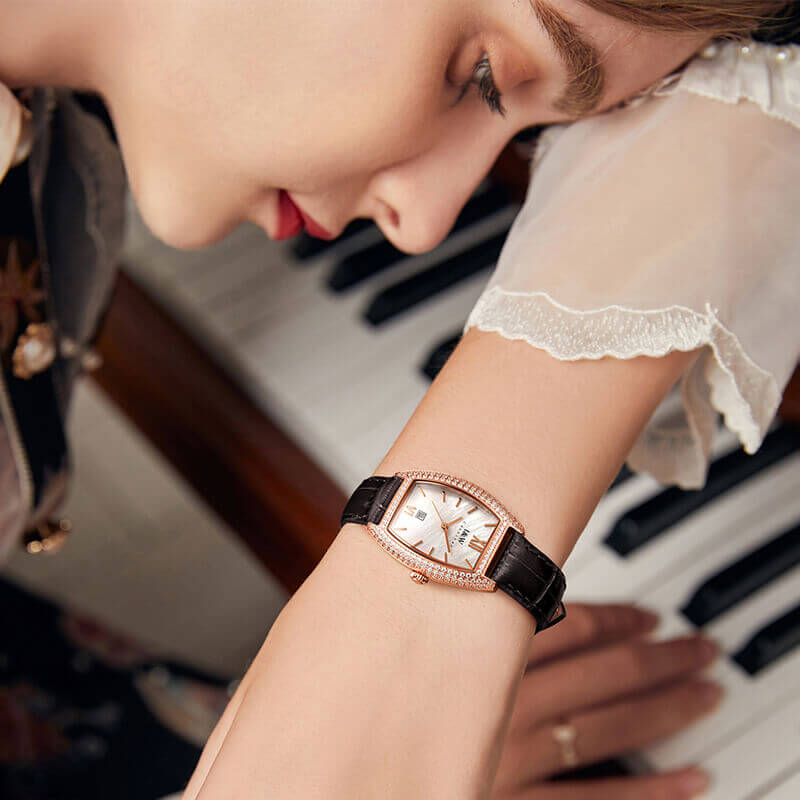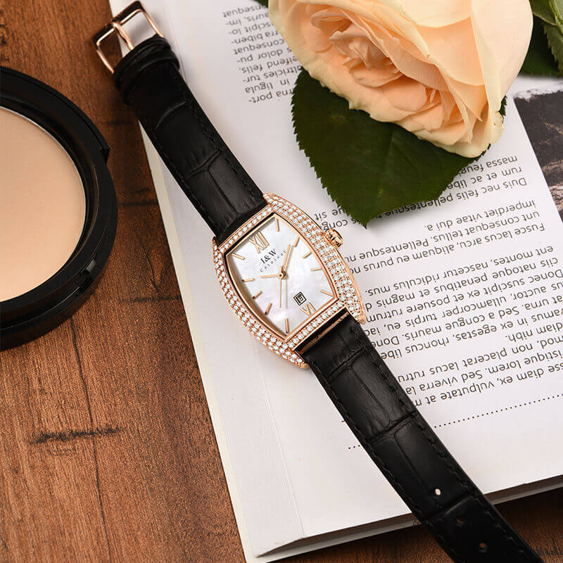- Phong cách thiết kế Dress watch với mặt đồng hồ màu trắng đính đá quý thể hiện sự sang trọng, quý phái.