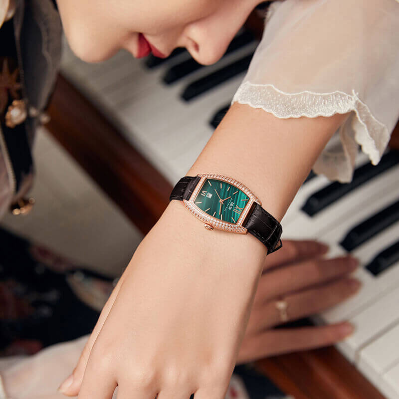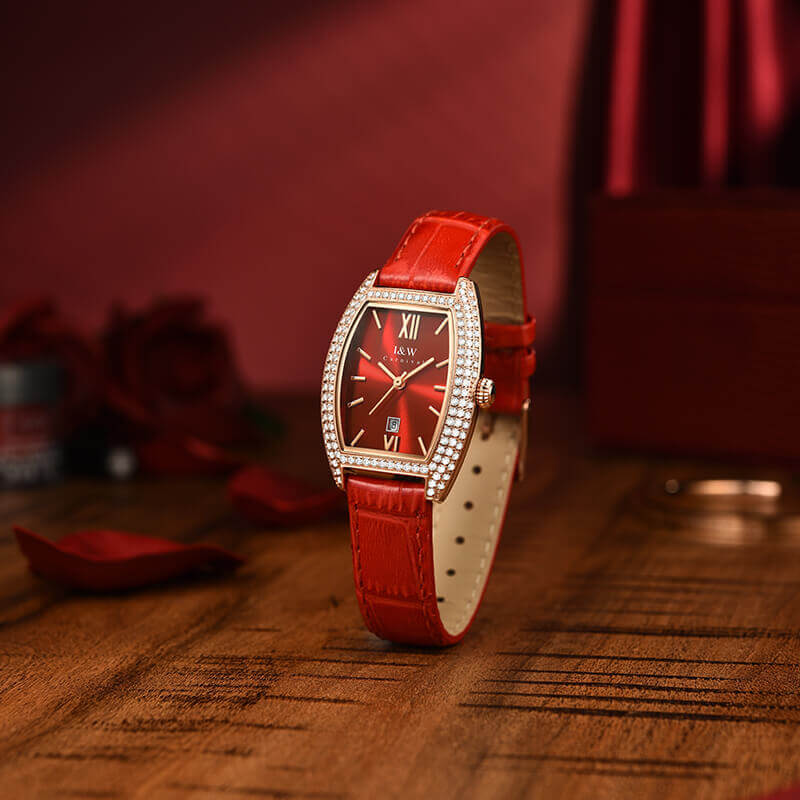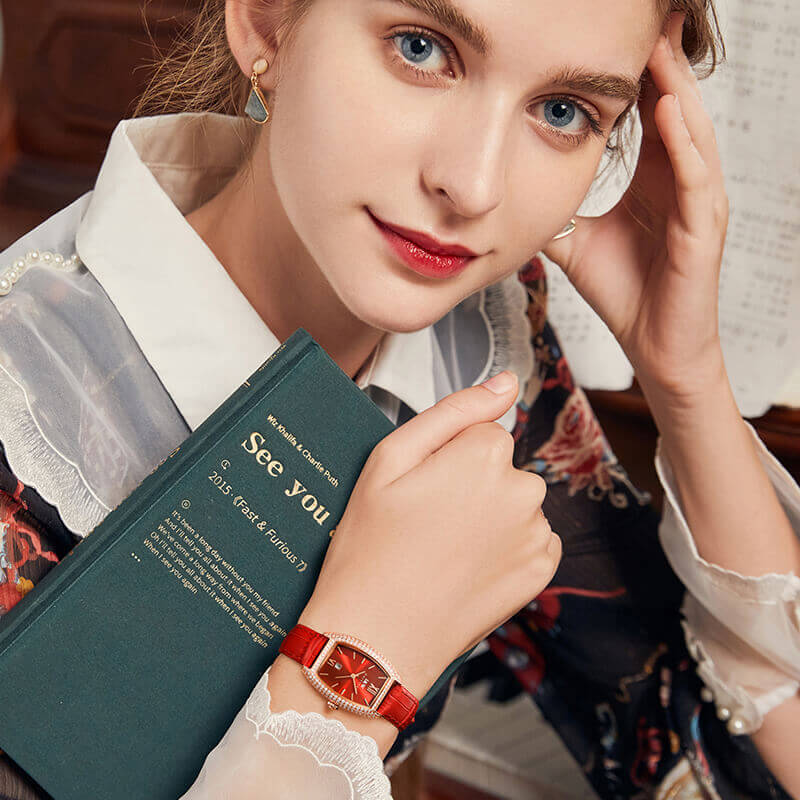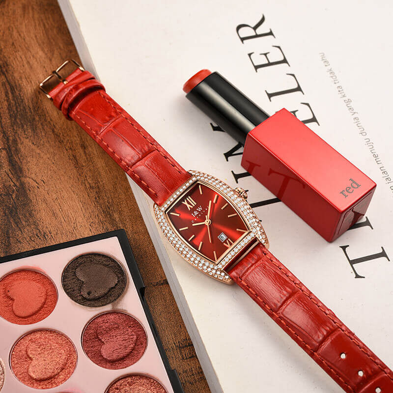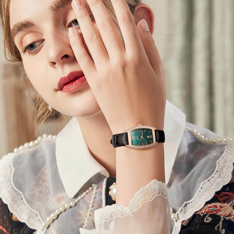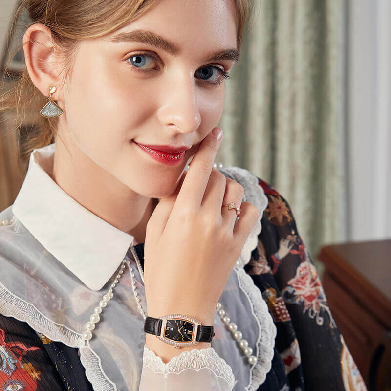 - Phong cách thiết kế Dress watch với mặt đồng hồ màu trắng đính đá quý thể hiện sự sang trọng, quý phái.