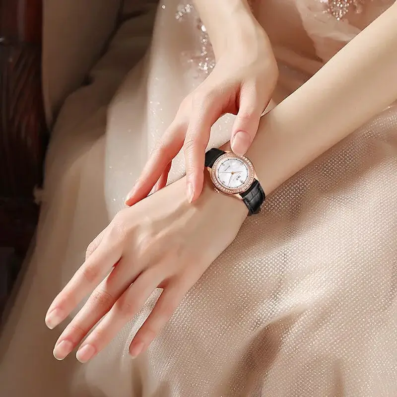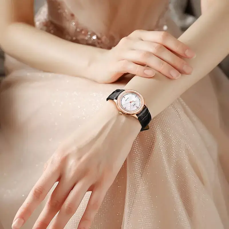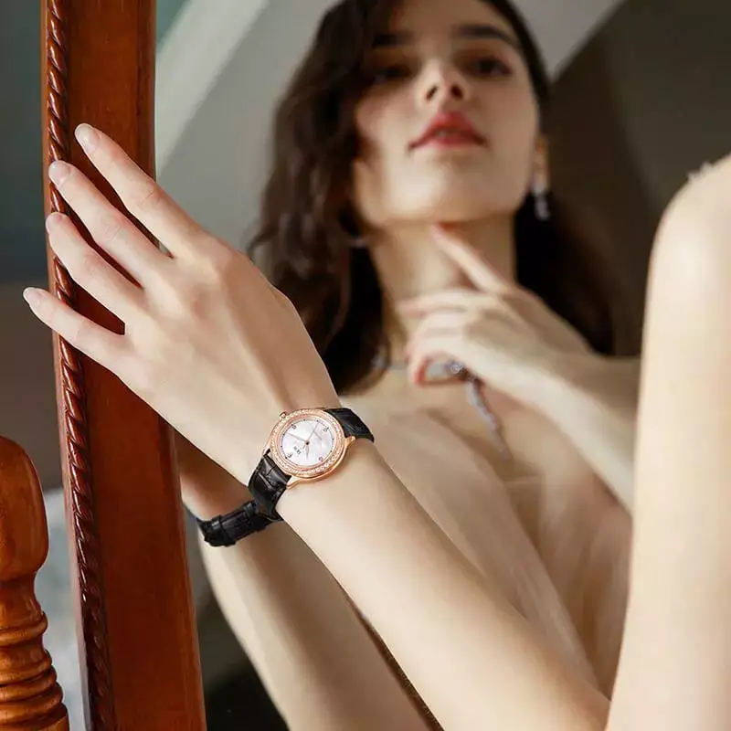 - Phong cách thiết kế Dress watch với mặt đồng hồ màu xanh đen phủ đá quý thể hiện bầu trời đêm đầy sao lấp lánh.