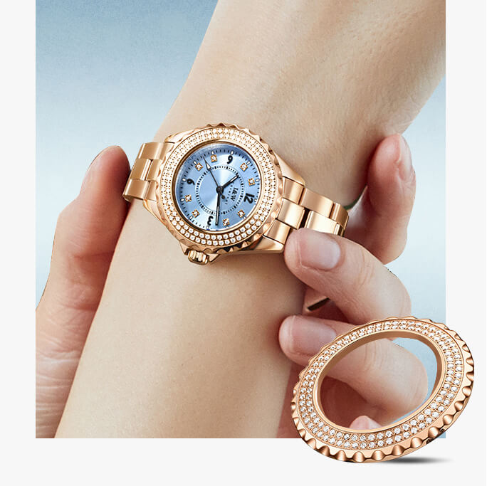 - Viền băm, đính 2 vòng kim cương nhân tạo lấp lánh, thu hút mọi ánh nhìn. |
