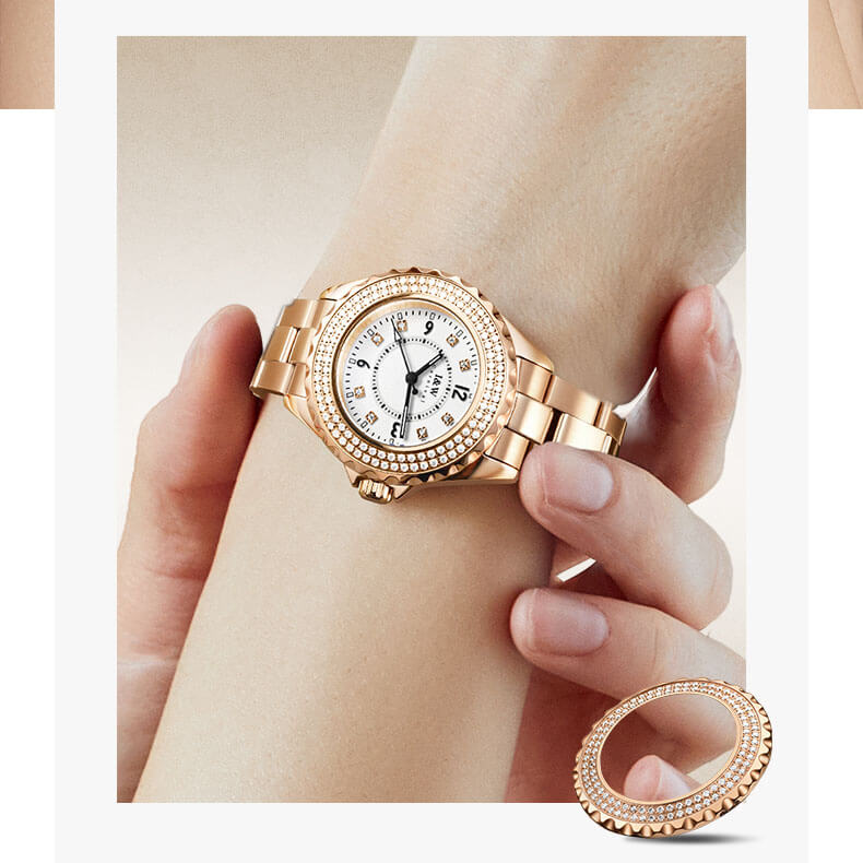 - Viền băm, đính 2 vòng kim cương nhân tạo lấp lánh, thu hút mọi ánh nhìn. |