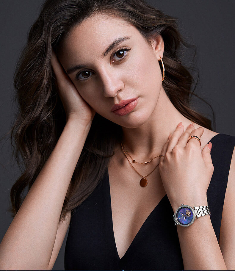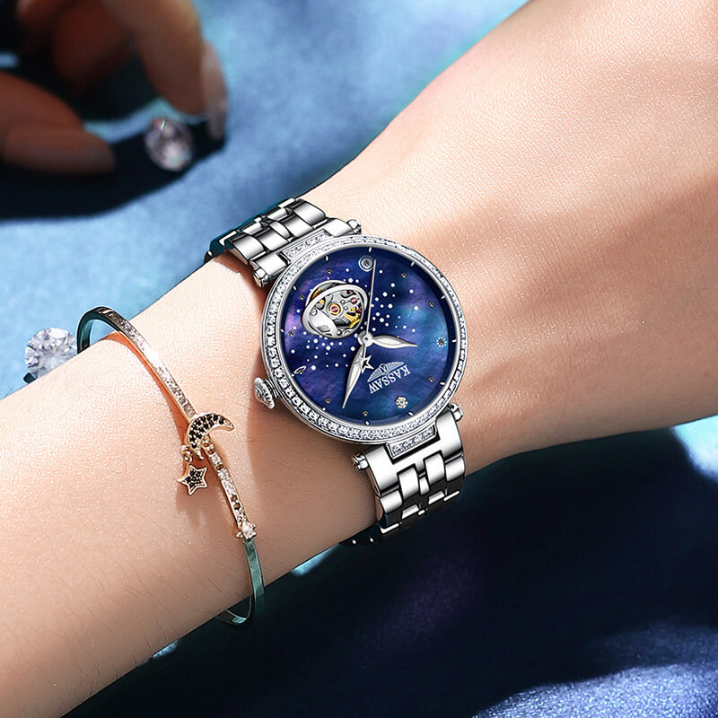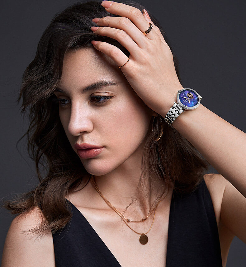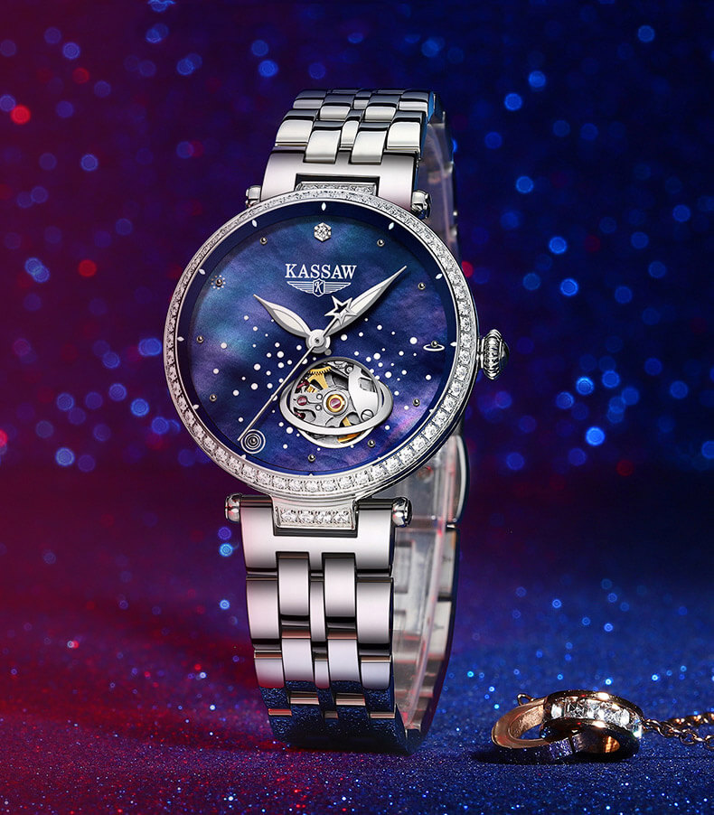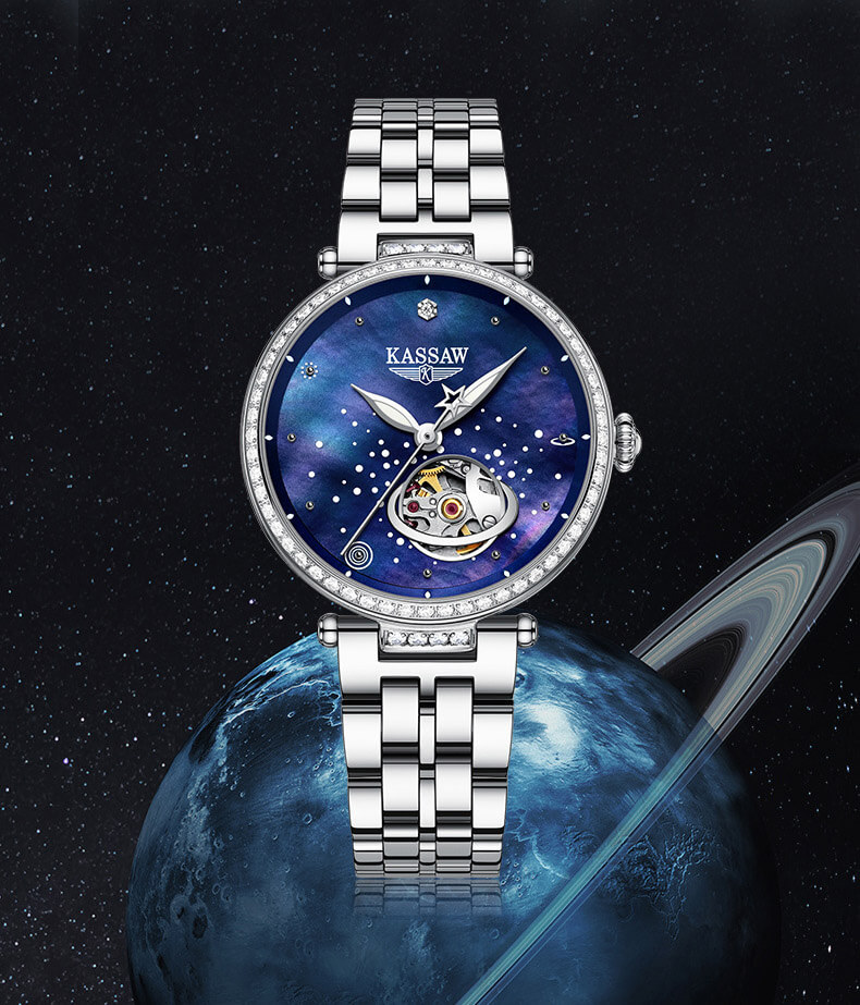 Đặc điểm nổi bật | - Phong cách thiết kế Dress watch, mặt đồng hồ in hình dải ngân hà. - Chức năng: Lộ tim tại góc 5h. - Kim giờ và kim phút phủ dạ quang, mặt số đính đá quý. |