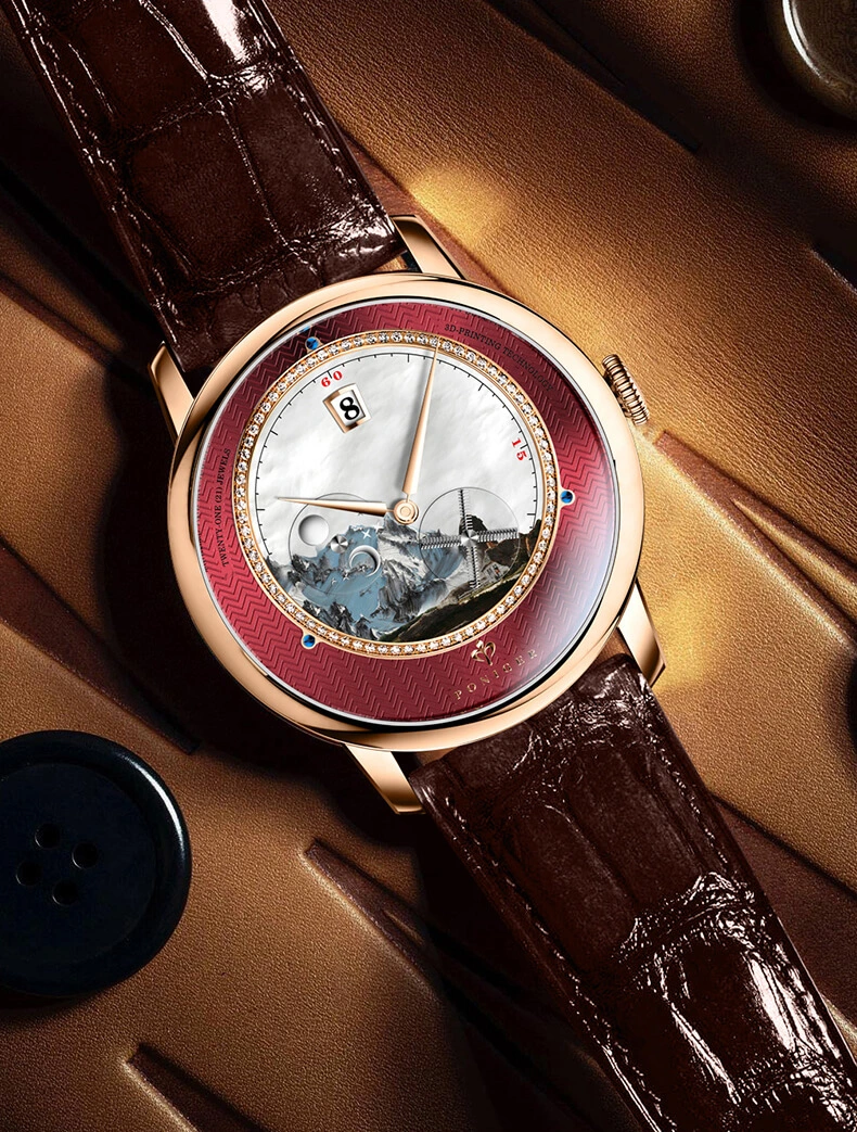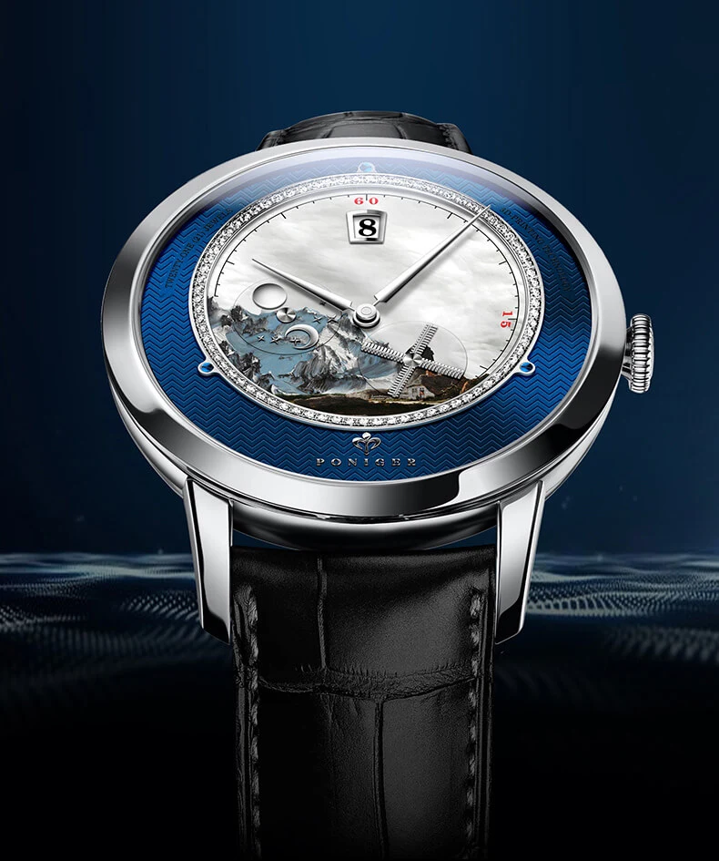 Poniger P723-2 mang lối thiết kế đơn giản nhưng sắc nét, lịch lãm và trẻ trung. Tất cả những sức hút kết thành một dấu ấn riêng, đặc biệt bức tranh dãy núi Alpes hùng vĩ, cùng bầu trời cao vút tạo nên điểm nhấn cho đồng hồ, kết hợp với dây da sang trọng, thanh lịch là một dấu ấn vô cùng đáng khám phá.