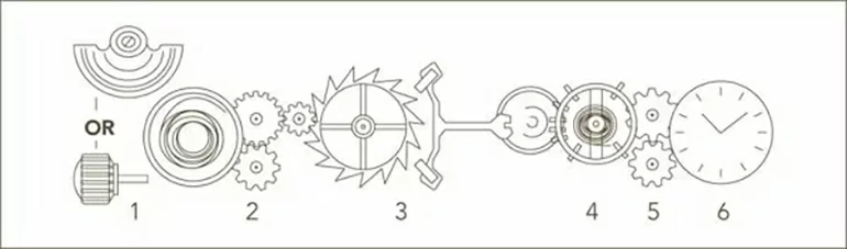 Sơ đồ tối giản các thành phần chính yếu của đồng hồ cơ