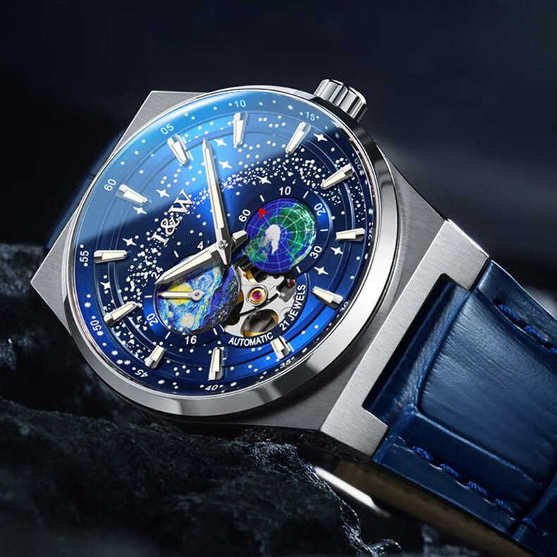 Điều đặc biệt ở I&W Carnival 708G1 chính là mặt số với tông màu xanh cùng với hàng ngàn ánh sao lấp lánh, cứ ngỡ như hiện trước mắt là cả bầu trời đêm lung linh huyền ảo. Còn gì tuyệt hơn khi em này ngự trên cổ tay đầy kiêu hãnh của chàng!