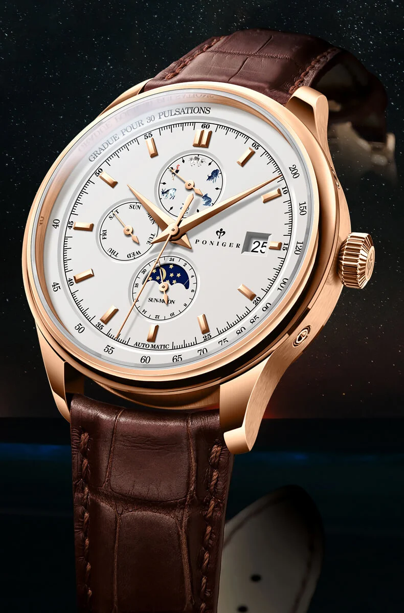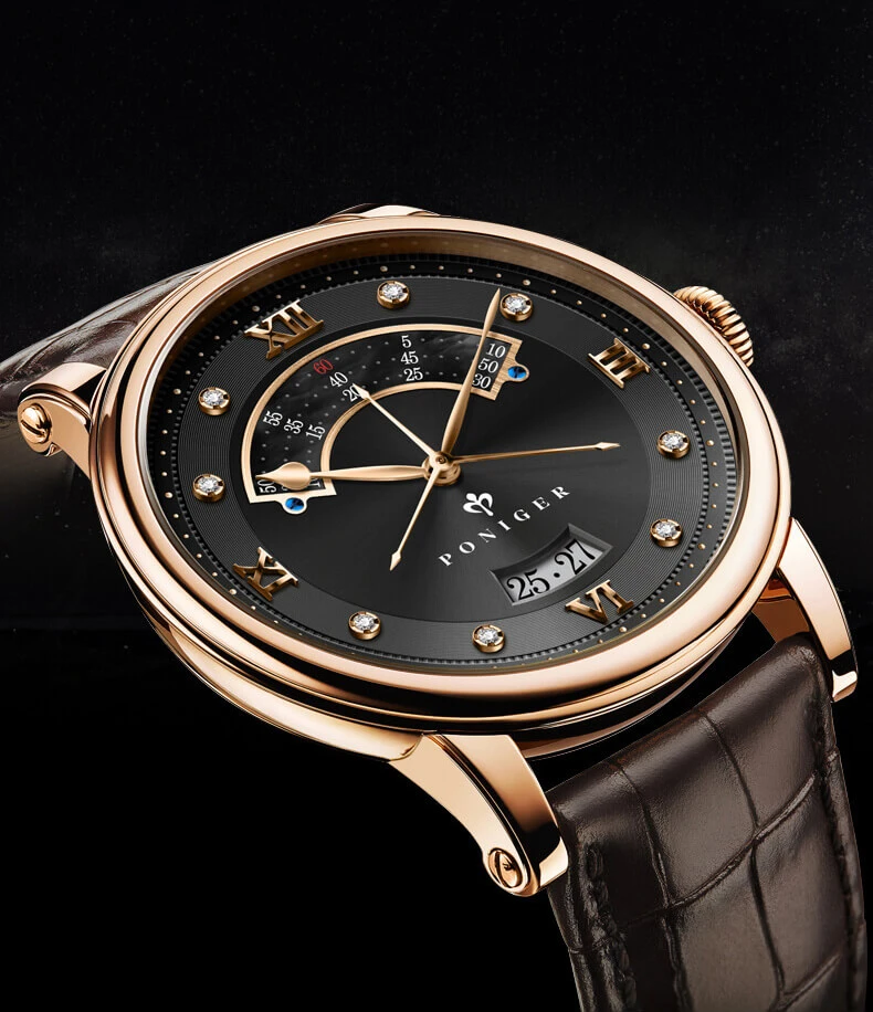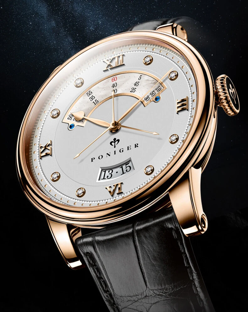 Đặc biệt, đồng hồ Poniger còn có những tính năng vô cùng xịn sò như: Open Heart, lịch ngày, lịch Sun and Moon,… Ở một số phiên bản còn được nhà sản xuất sử dụng khéo kỹ thuật điêu khắc nghệ thuật Guilloche để tạo nên sự hài hòa về tổng thể.
